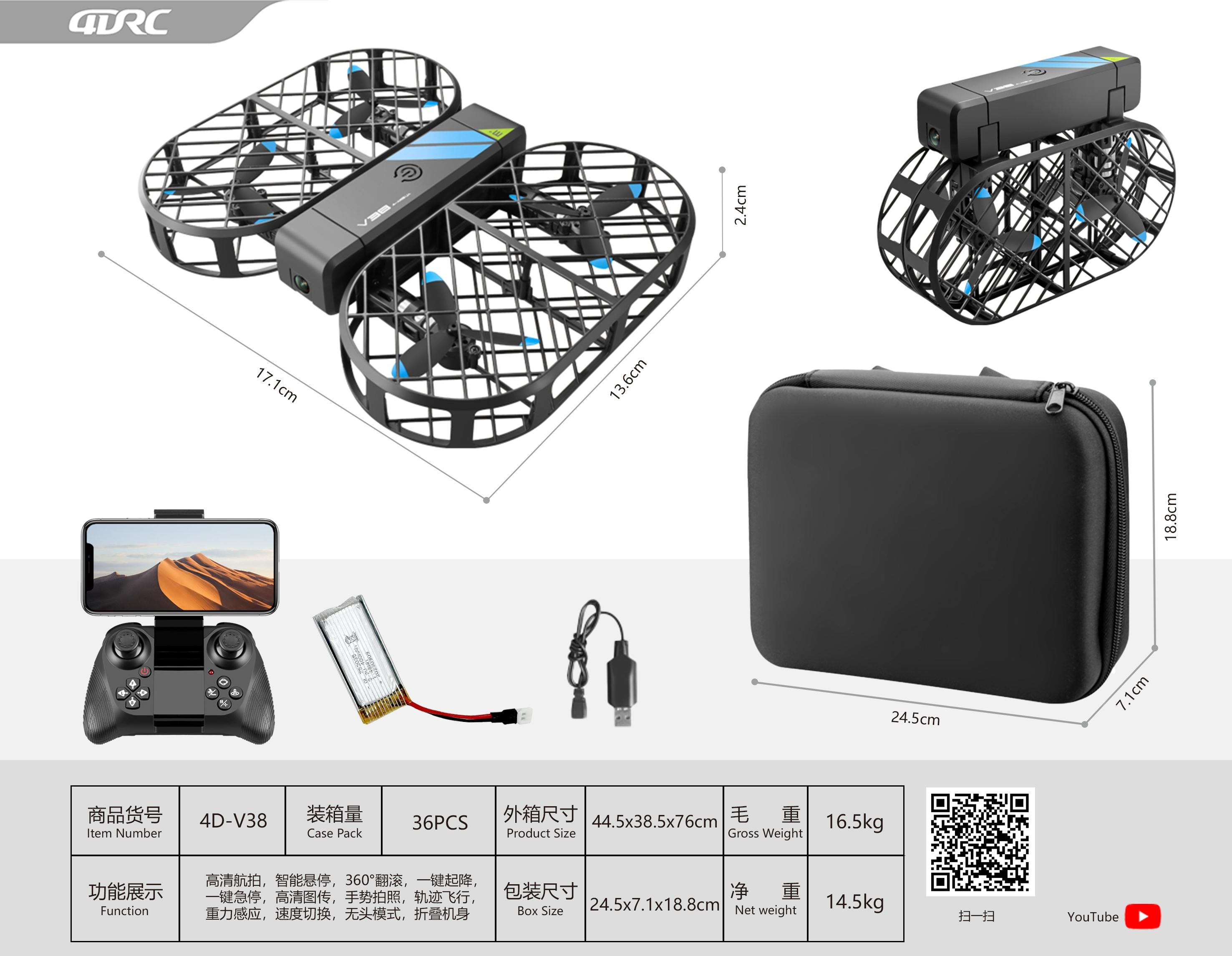 Function: One key take-off/landing, Forward/backward, Turn left/right, Left/right side-flying, Ascent/descent, Altitude hold, Auto hover/flip, Headless mode, Roll over to stop. (Only Available for Camera Option, WiFi camera with selfie, APP FPV real time transmission)