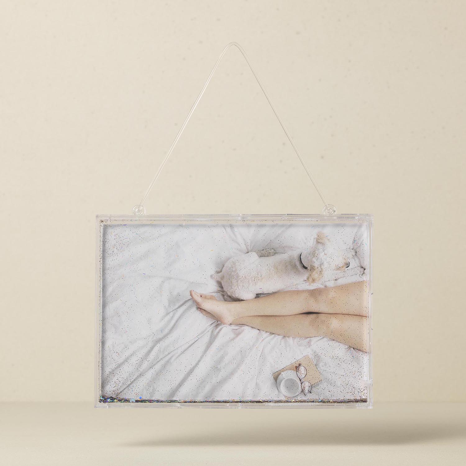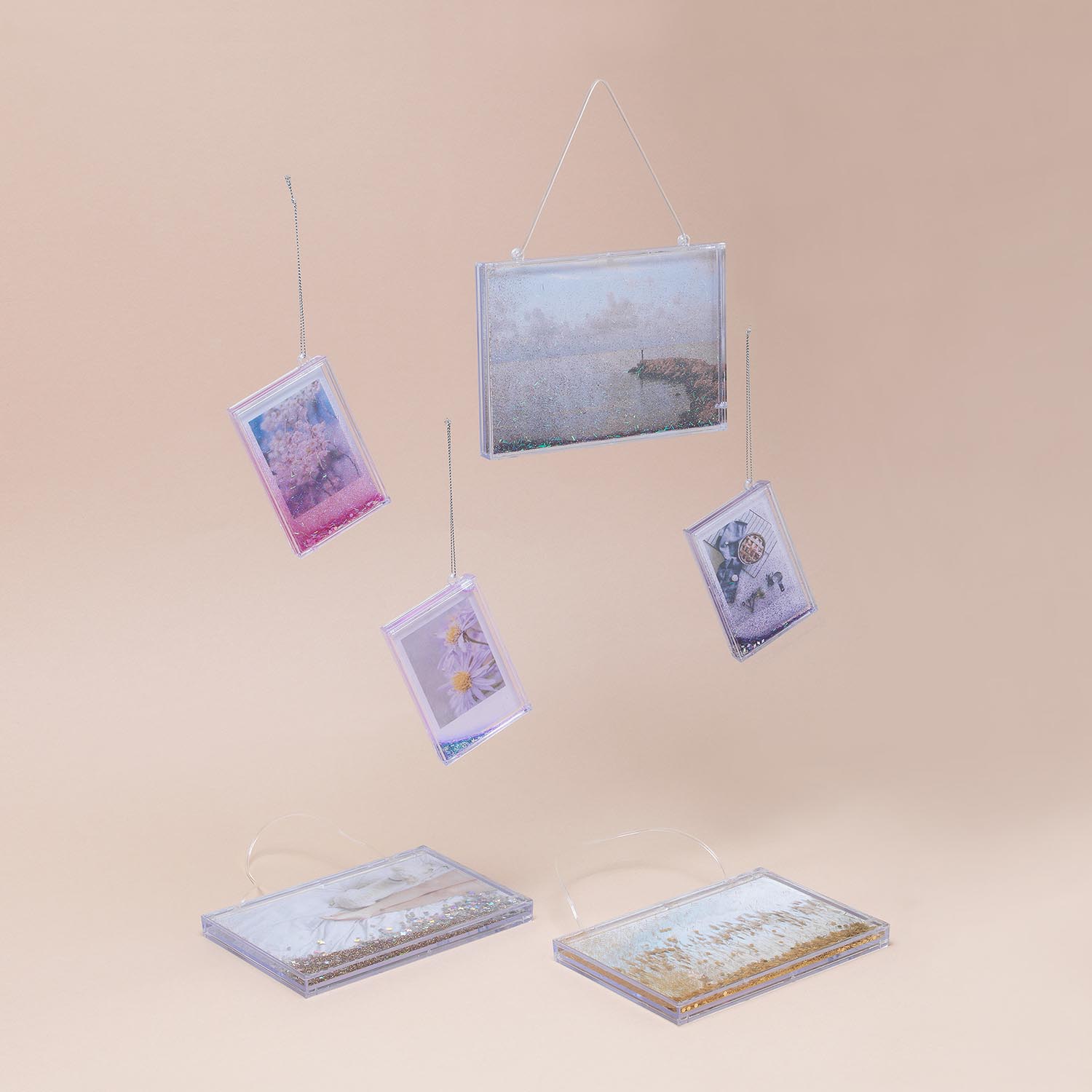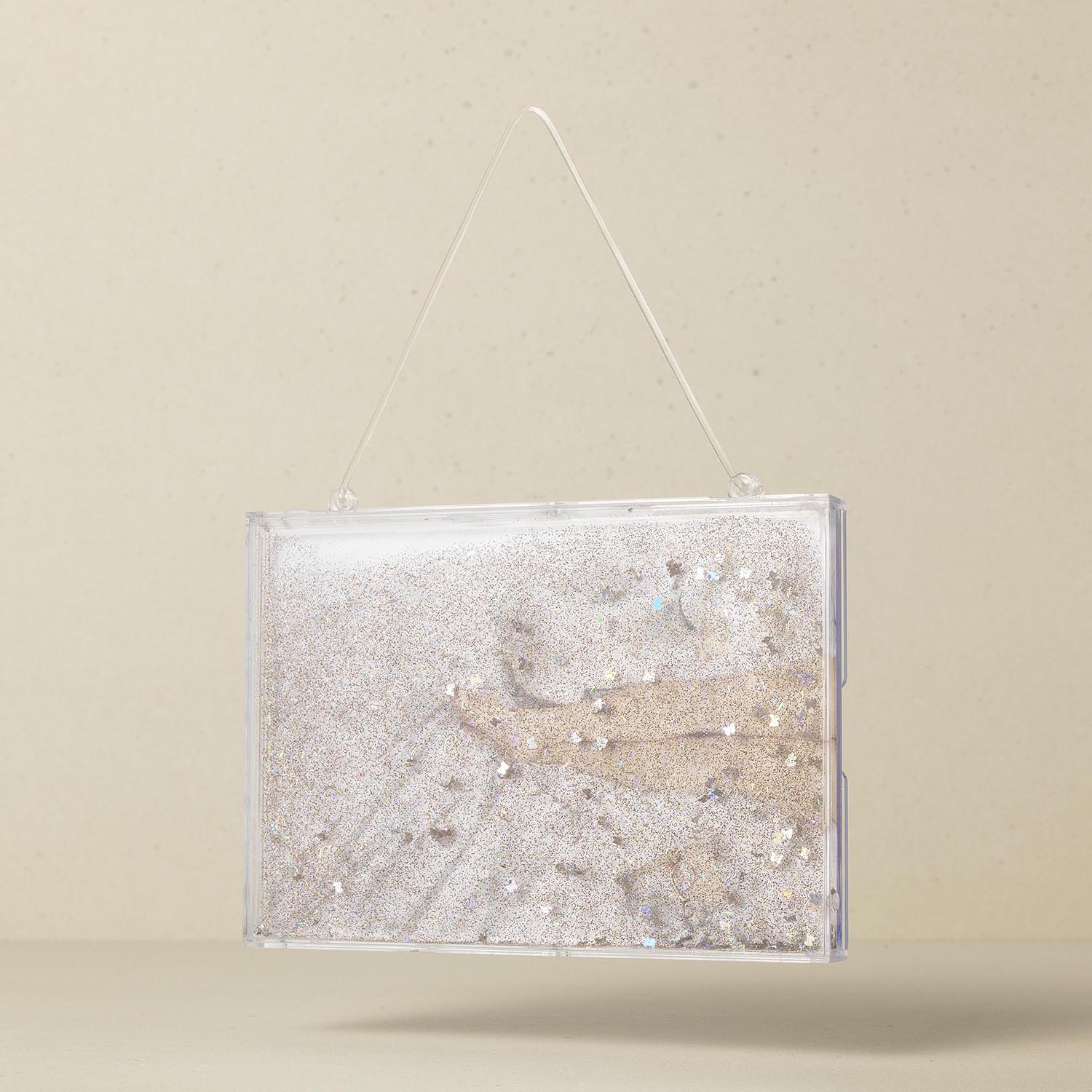 Rectangular glitter frame ornament filled with water and shimmering glitter inside, that is ideal for displaying photo and decorating Christmas tree or any wall space. Fits 4x6” photo.