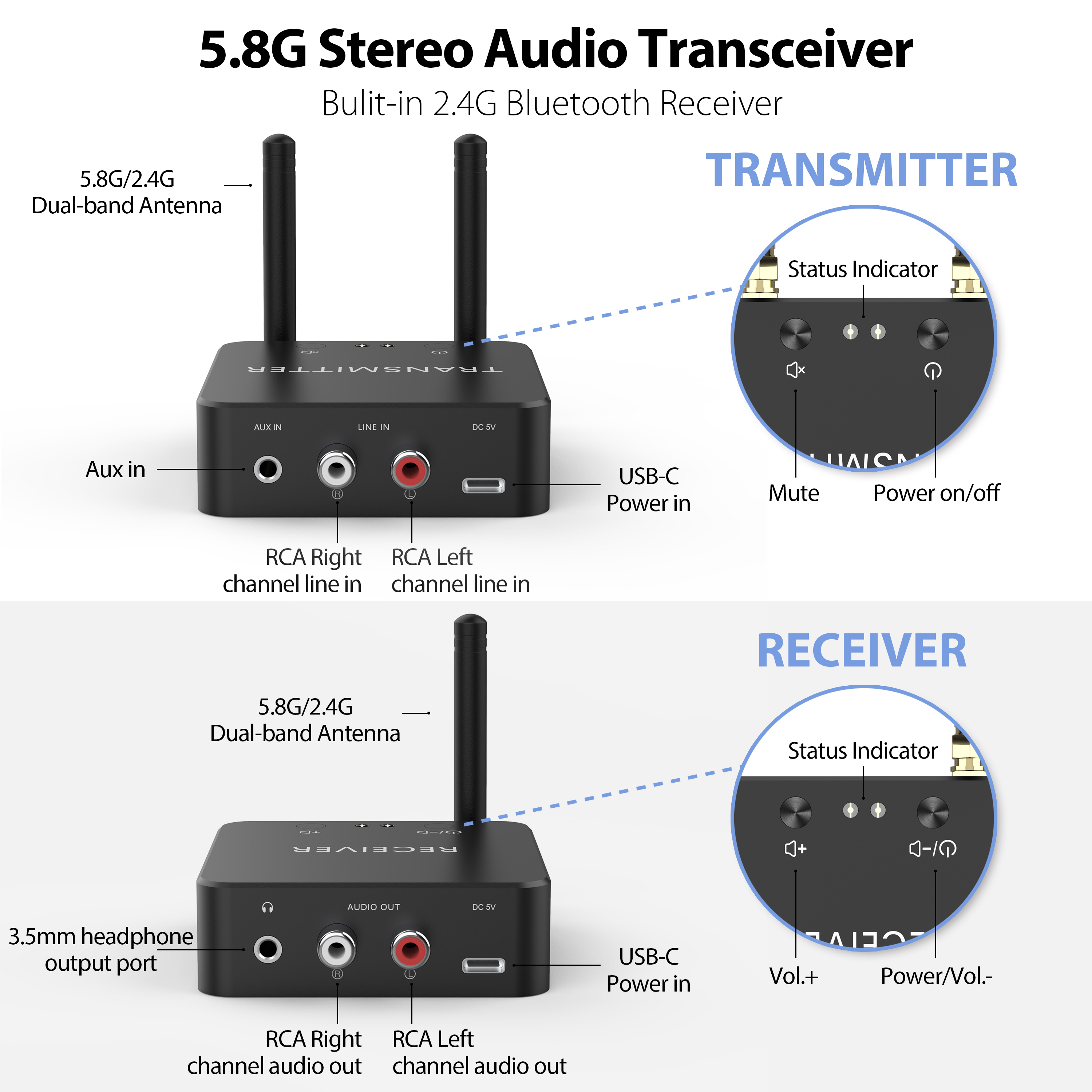 1.【5.8GHz&5.2GHz Dual-band Wireless Stereo Audio Transmitter and Receiver】 Compared to the traditional 2.4GHZ, 5.8GHz&5.2GHz Dual-band has a larger bandwidth, better stability and less interference. It fundamentally solves the situation of channel congestion and dropped lines.