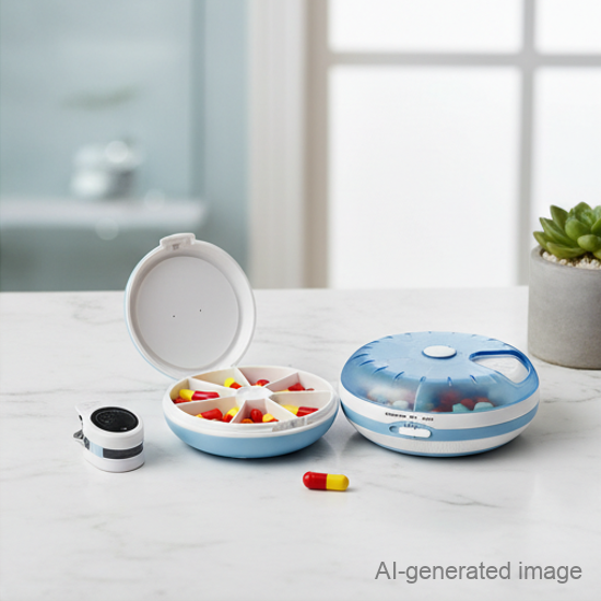 5 pill compartments, each has its exclusive alarm to work with (for people who take different medicine at different time)