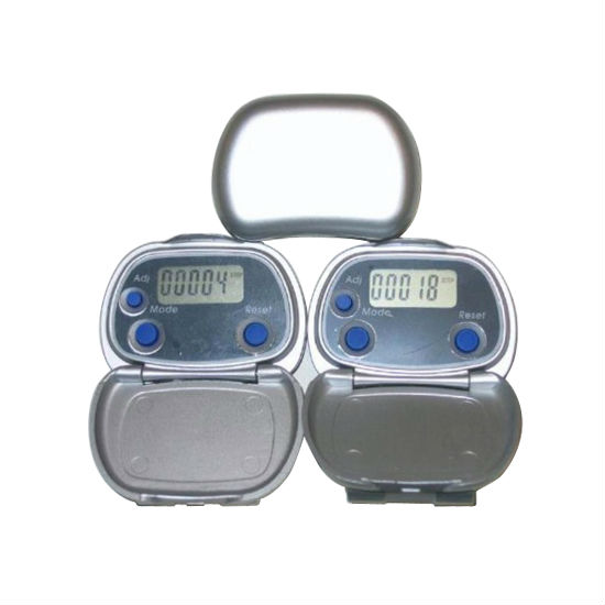 Displayed here is a portable pedometer that measures steps you take accurately and conveniently. The 5-digit device comes with a silver casing for added protection. Simple yet functional, this tiny and lightweight pedometer is great for all walkers and hikers.