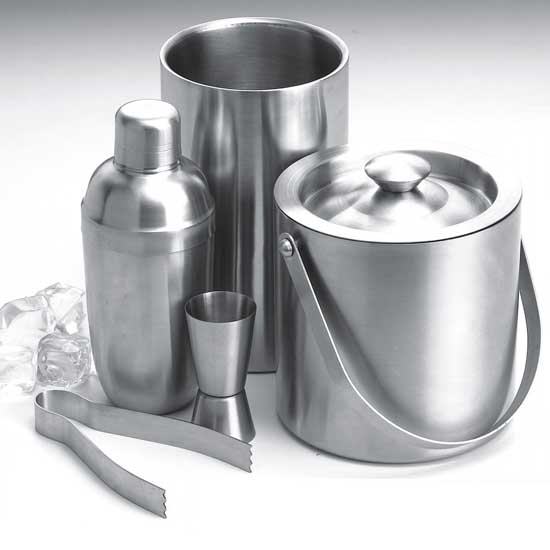 The featured bar set comes with a wine bucket, a wine cooler, a cocktail shaker, tongs and a peg measure. Made of stainless steel, the set is sturdy and durable. It is suitable for use in bars, pubs or hotels.