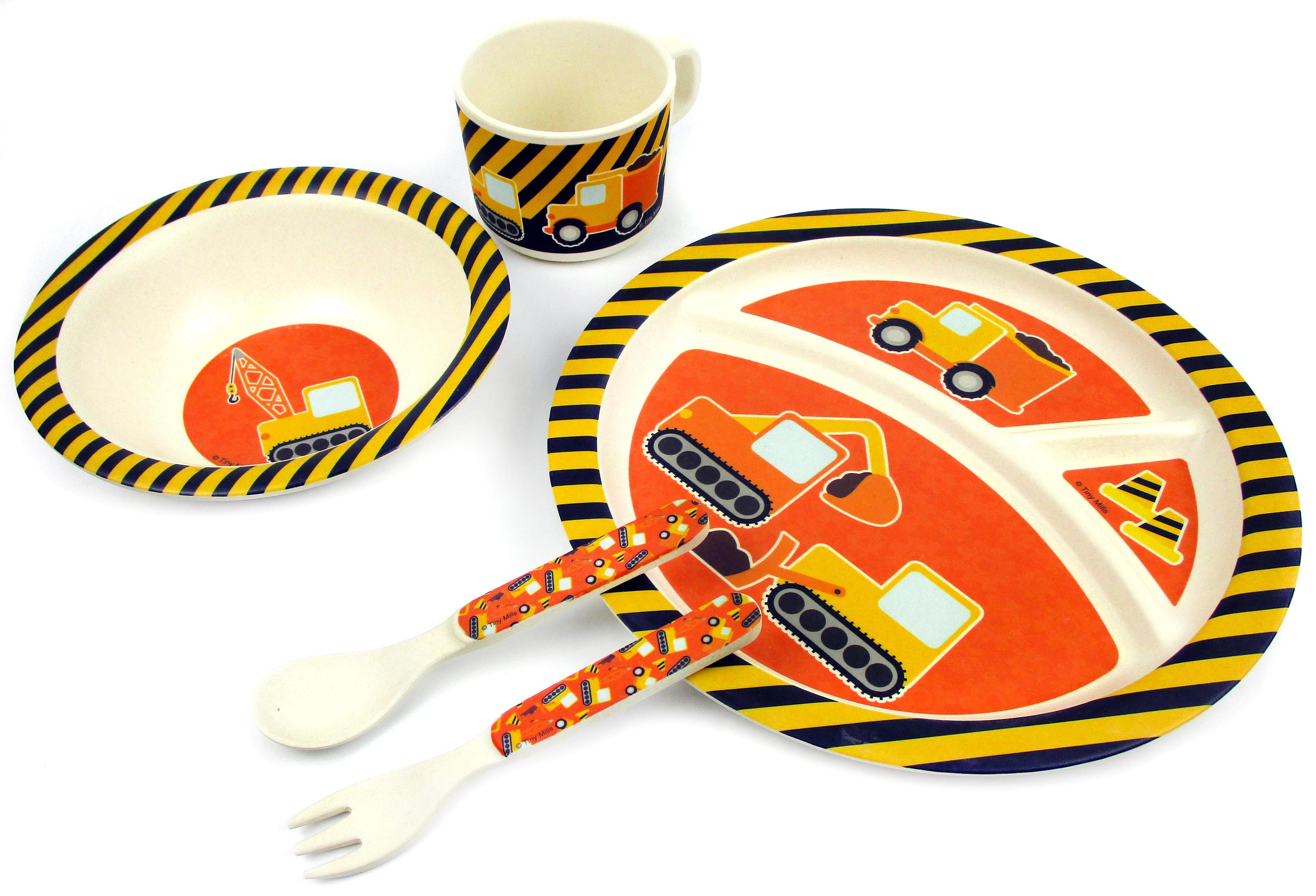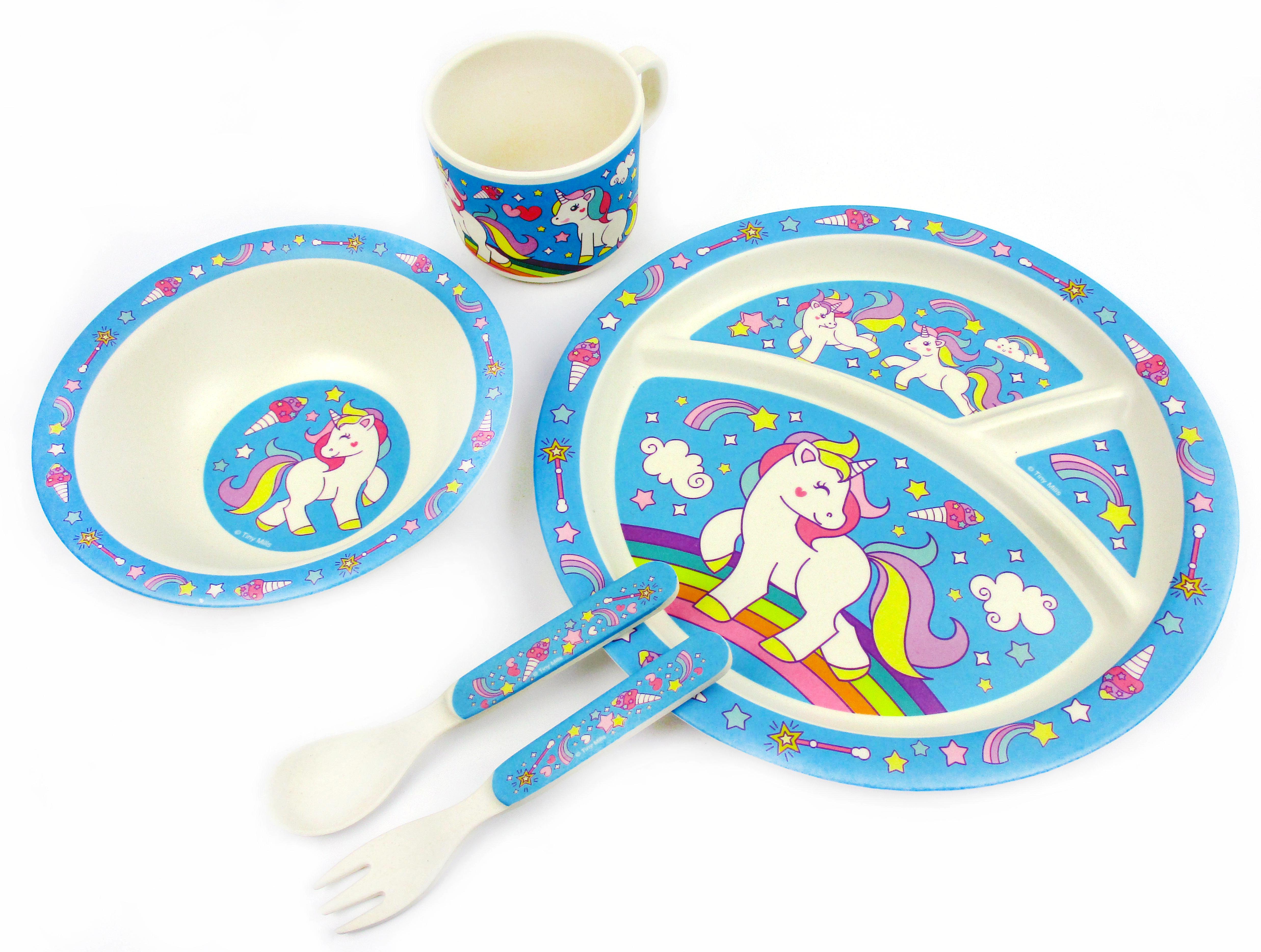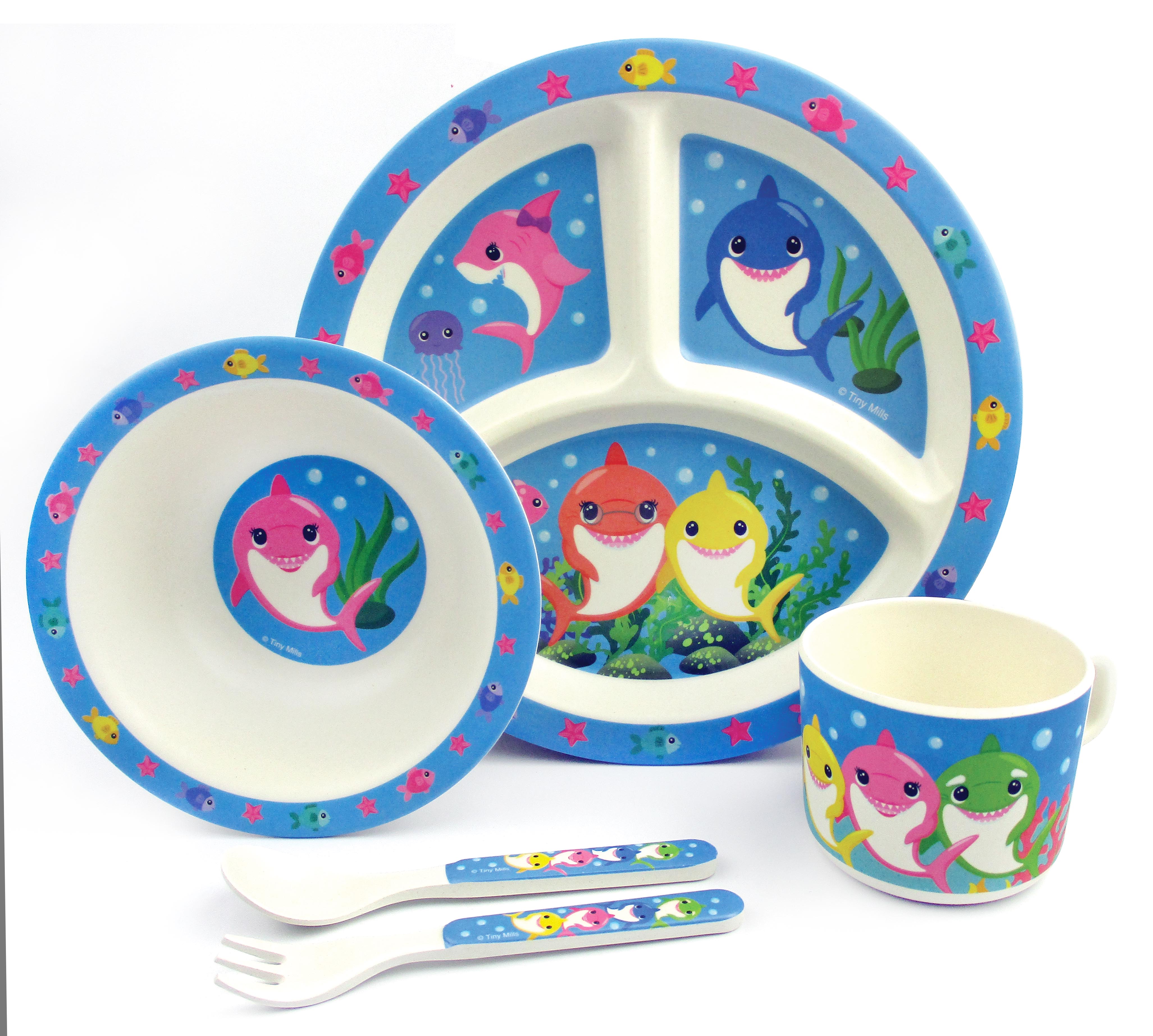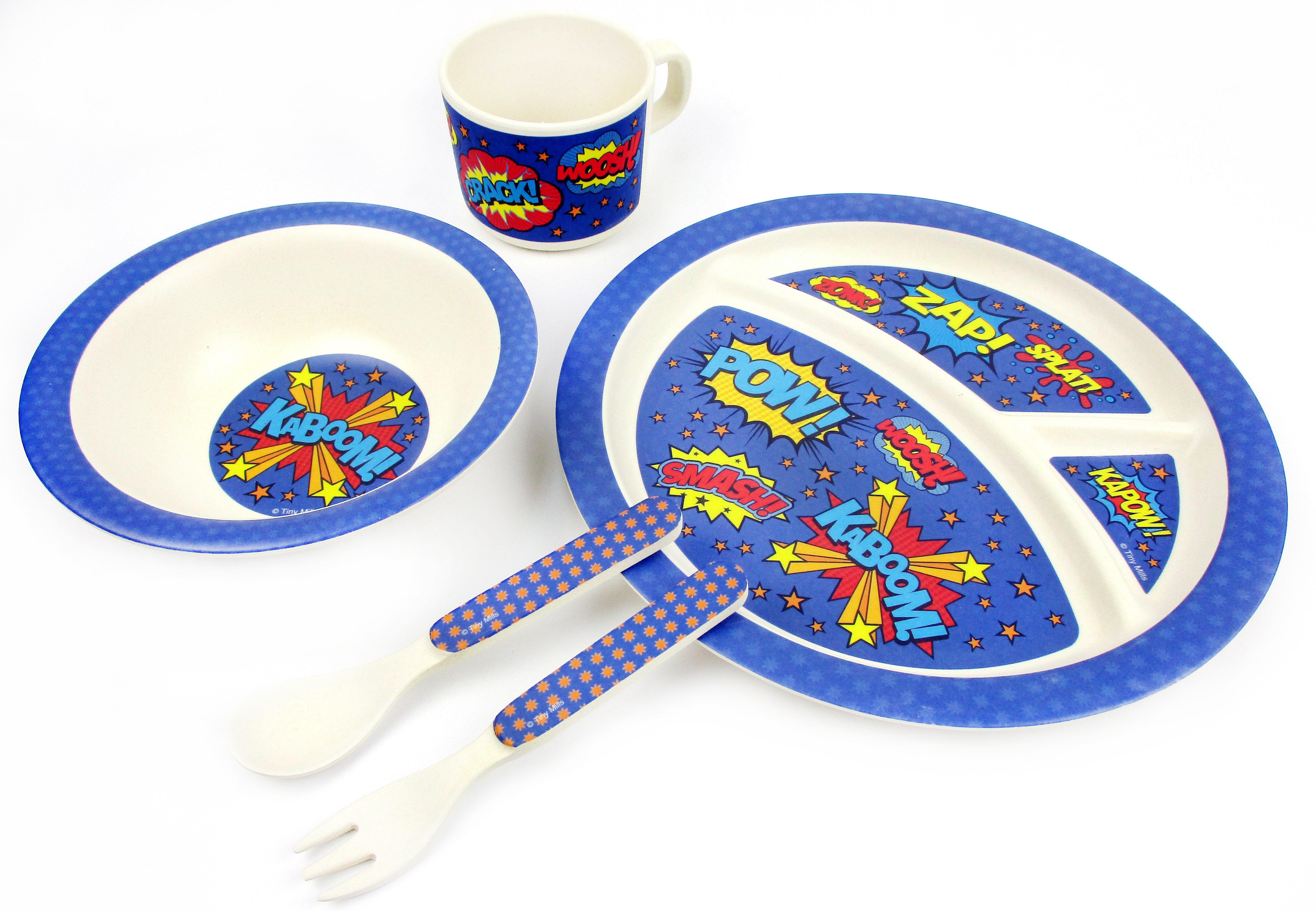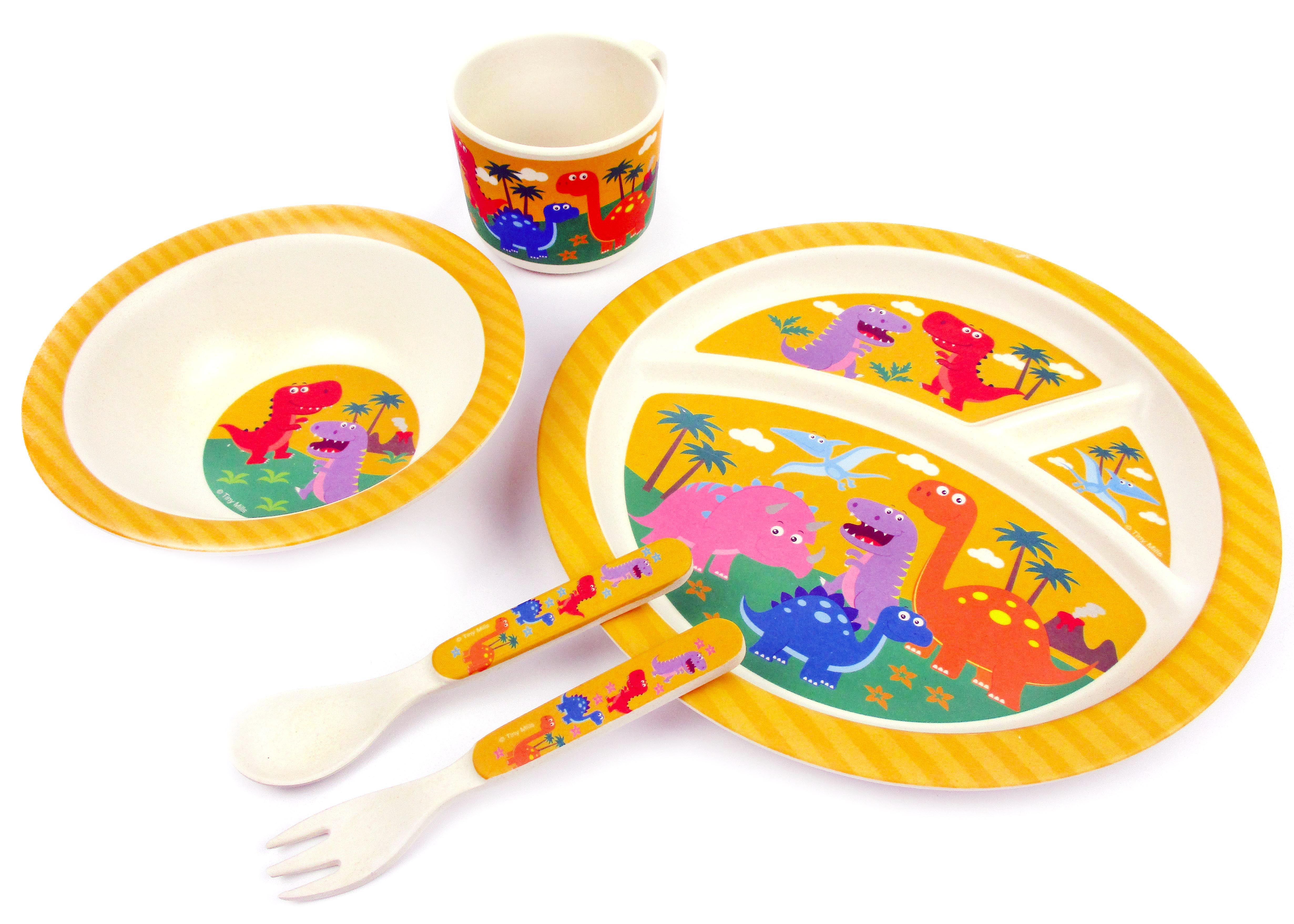 Each set comes with a plate with dividers, a cup, a fork, a spoon, and a bowl.