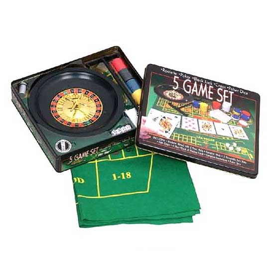 Highlighted here is a game set that comes in a 5-in-1 design. This game set includes a roulette game, a poker game, a black jack game, etc. This 5-in-1 game set offers loads of fun and amusement for party use.