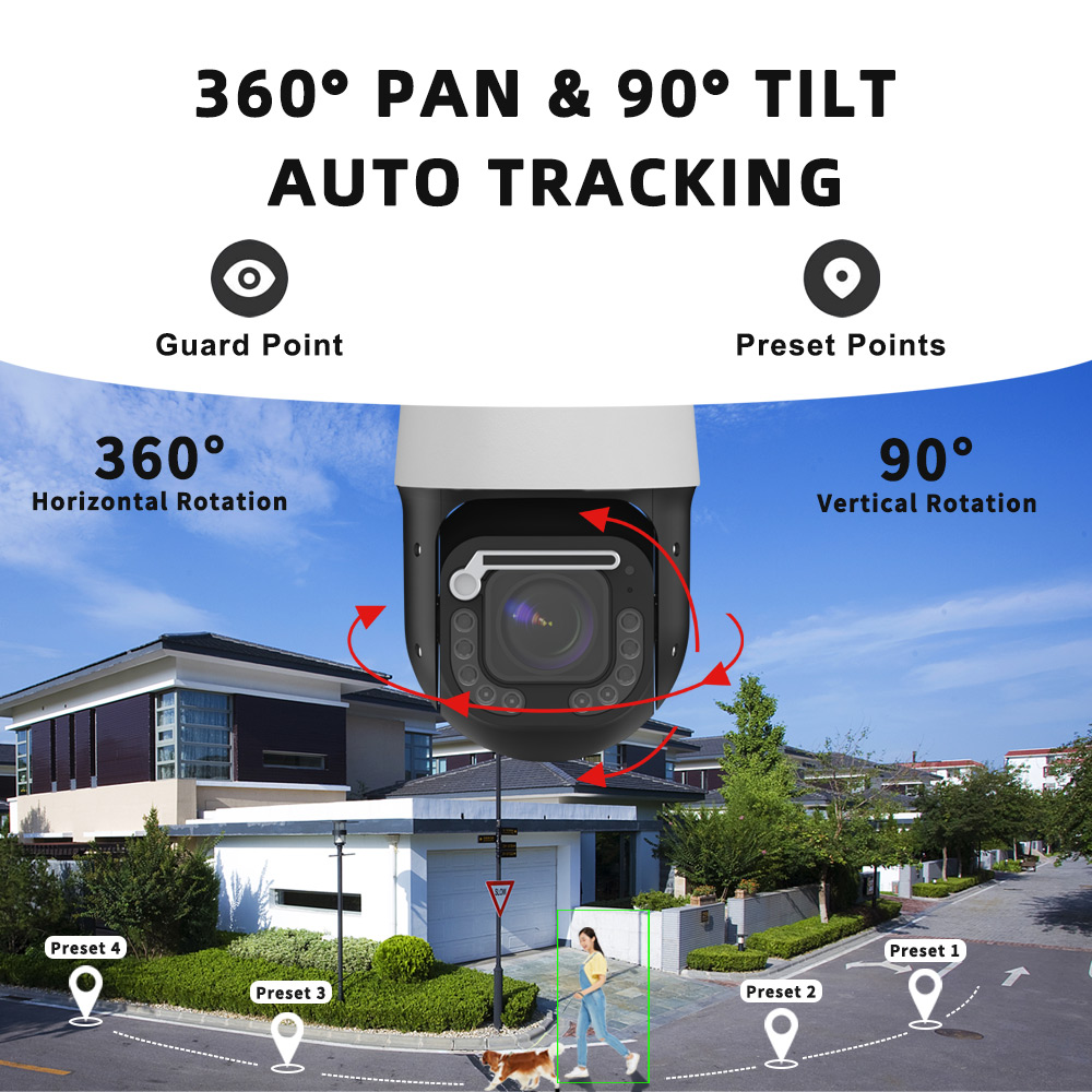 • AI Auto-Tracking: Automatically detects and follows humans/vehicles with 20x optical zoom (4.7–94mm motorized lens) and 360° pan/tilt coverage.