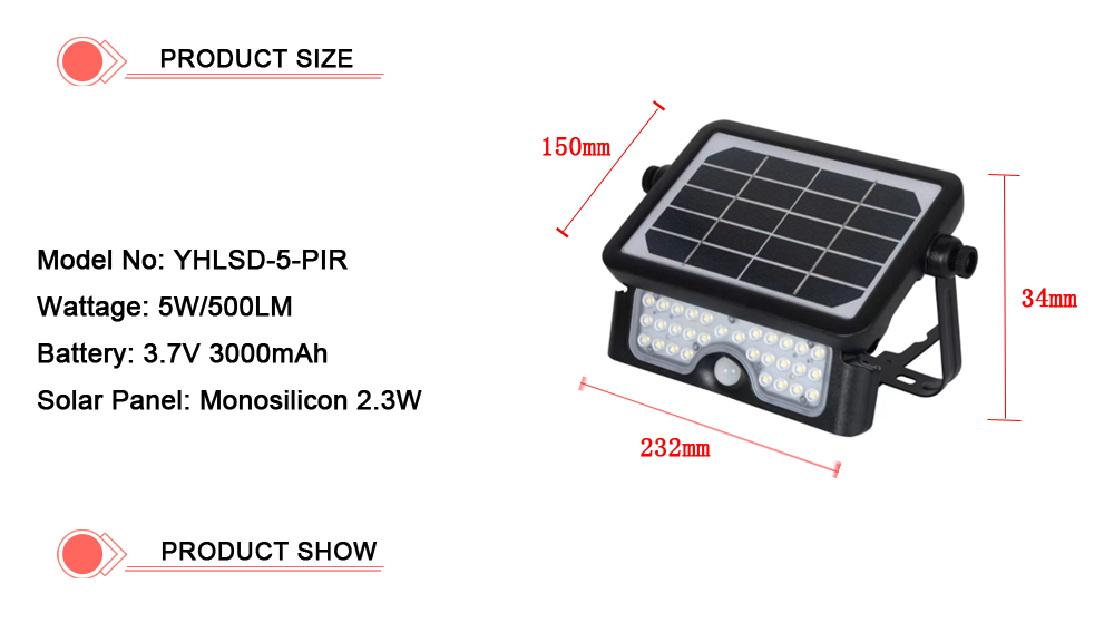 5W Adjustable YHLSD-5-PIR outdoor waterproof solar sensor street light portable LED Solar flood lights with solar panel