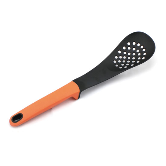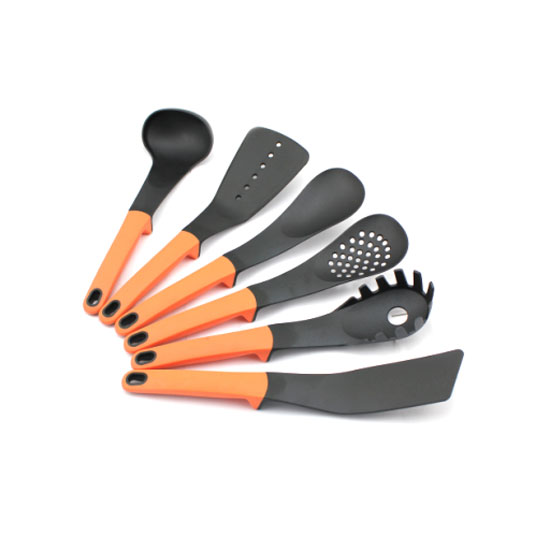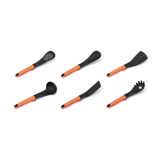 This 6-piece kitchen utensil set comes with a soup ladle, skimmer, solid spoon, slotted turner, turner and pasta server. Each piece features a consistent design with a black head and orange handle. This highly practical set is great for all modern kitchens.