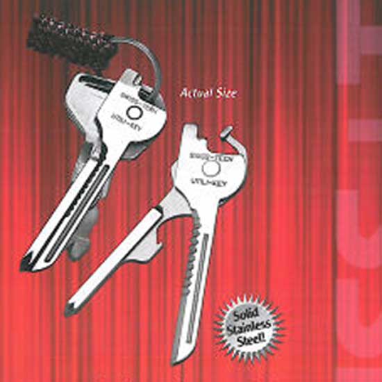 This key-shaped multi-function micro tool features a 6-in-1 design. It consists of a fat screwdriver, a micro eyeglass screwdriver, a bottle opener, a serrated knife blade, a straight knife blade and a Phillips screwdriver. This well designed tool combines style and advanced functions effortlessly.