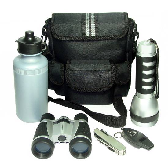 This is a 6 in 1 sports equipment set which includes a whistle with compass, binoculars, water bottle, foldable knives,torch and a sports bag.