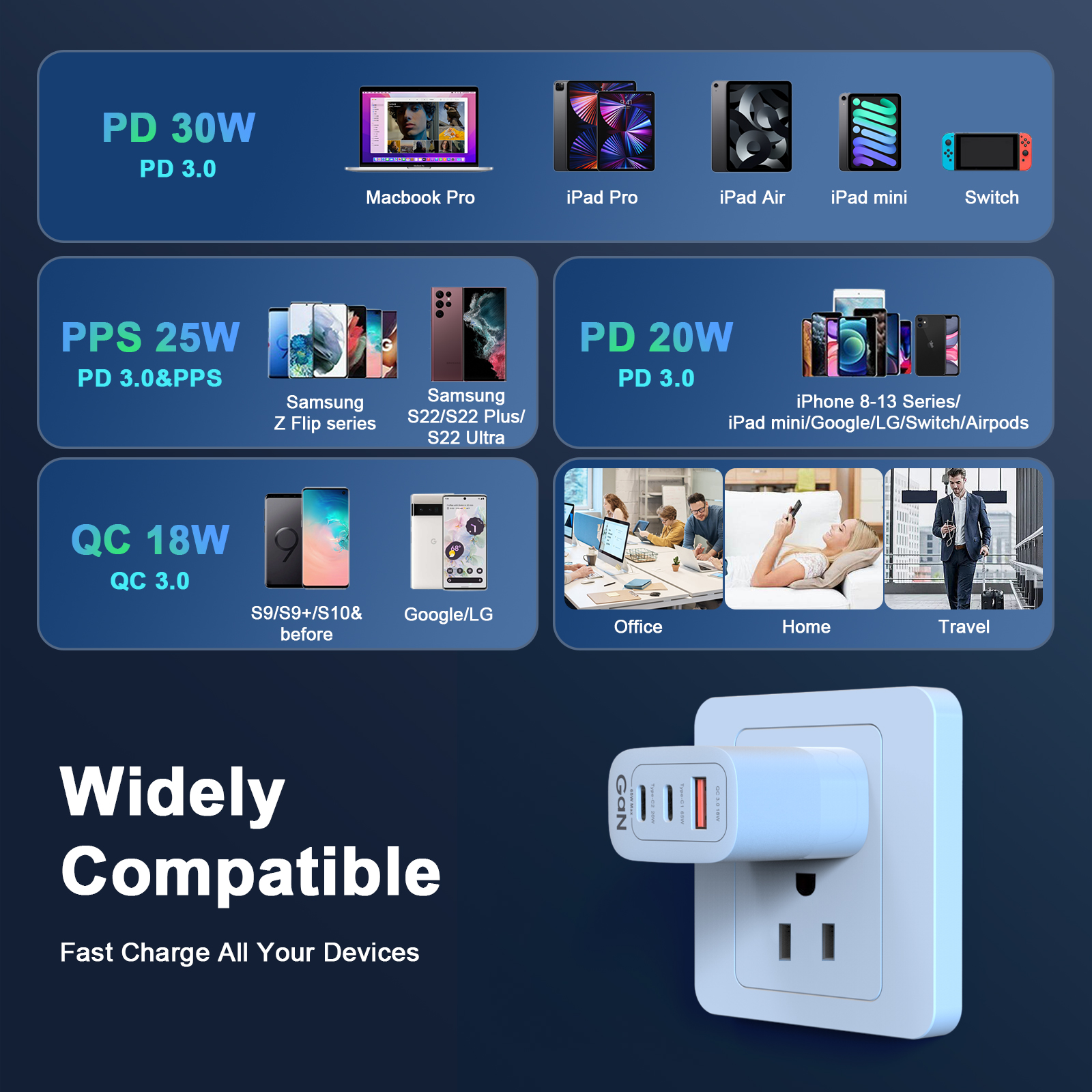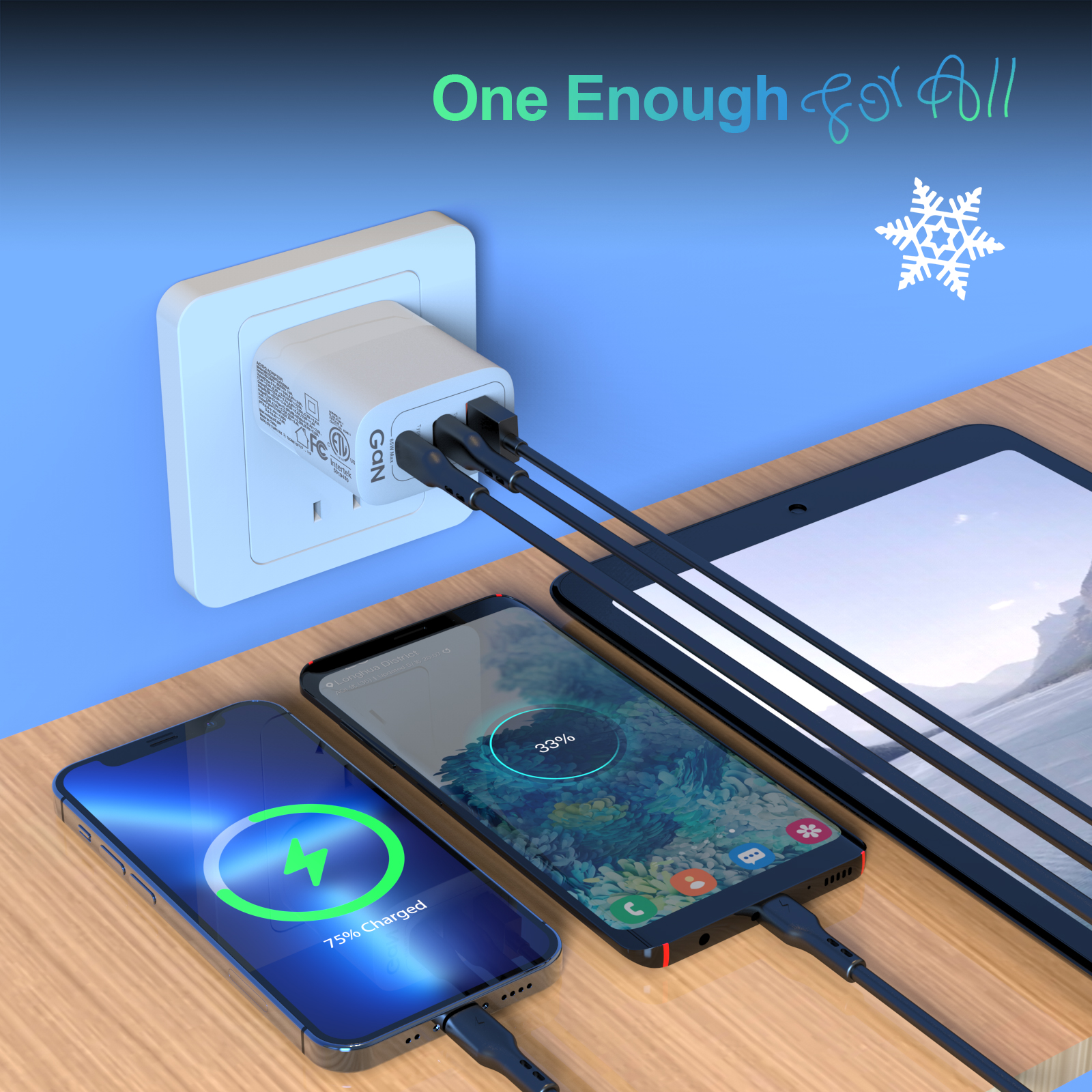 4. 【Multiple Protection & Gan Technology】Built-in GAN technology safeguards protect your devices against excessive current, overheating, and overcharging, the USB wall charger block will automatically stop charging when power is full to protect your device.