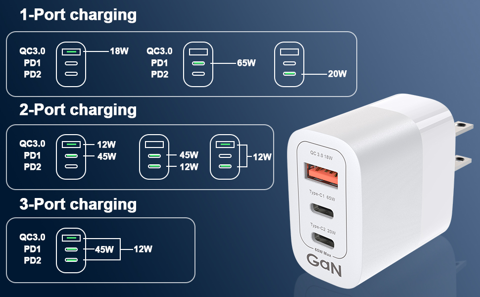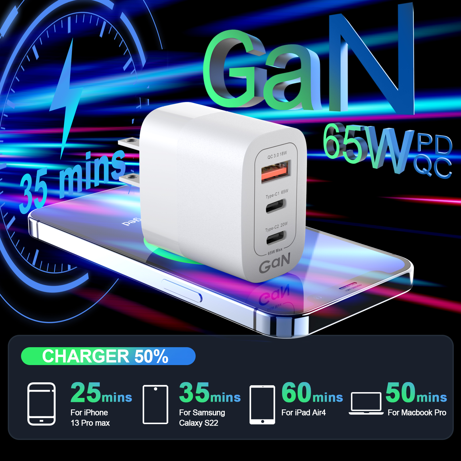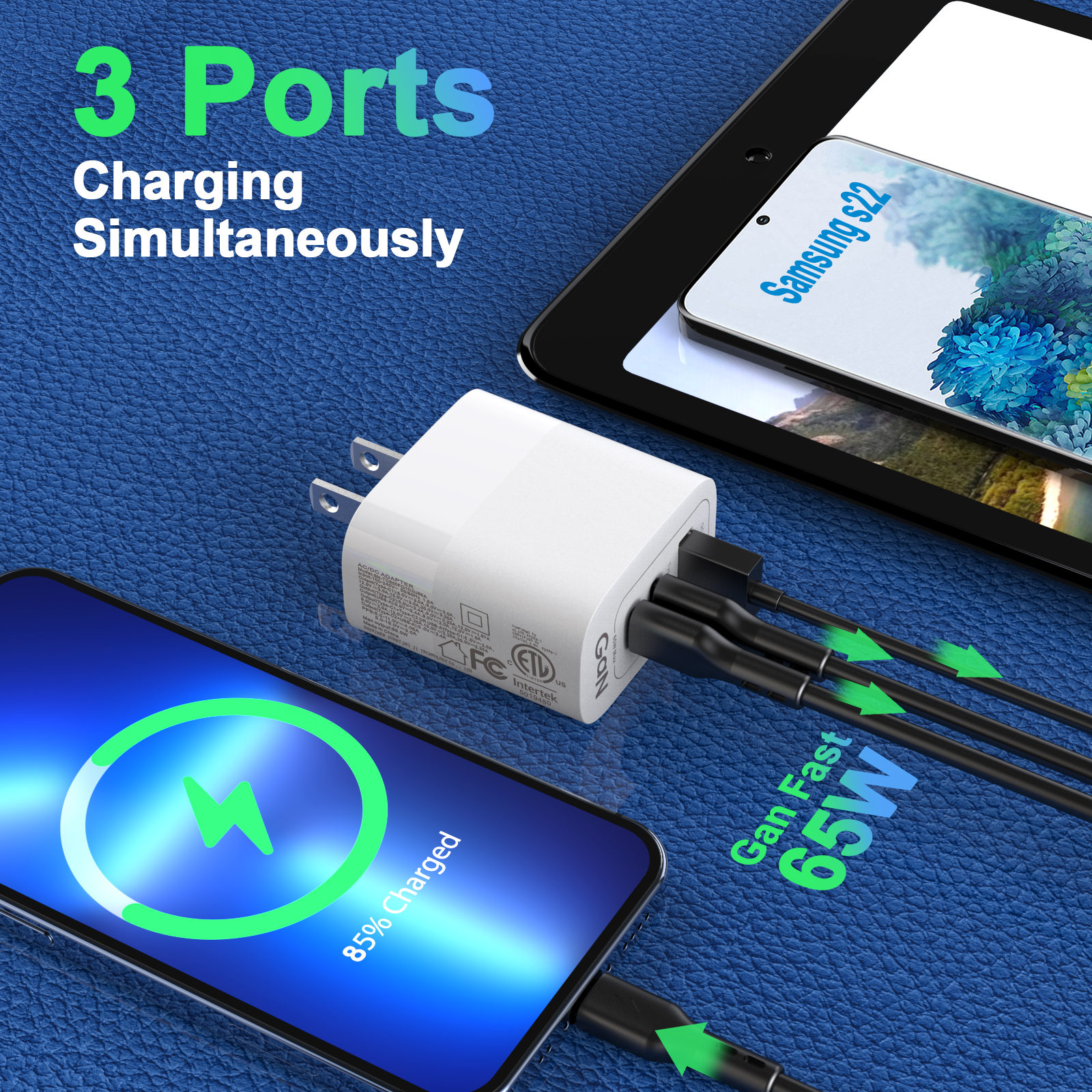 1.【Fast 65W Gan Wall Charger】Our USB C charger with one PD 65W PD3.0 USB-C charging port,one PD charging and one USB-A charging ports, this 65W (total) 3-Port charger supports fast charging for most mobile devices, allowing you to charge multiple devices simultaneously with only one charger block.