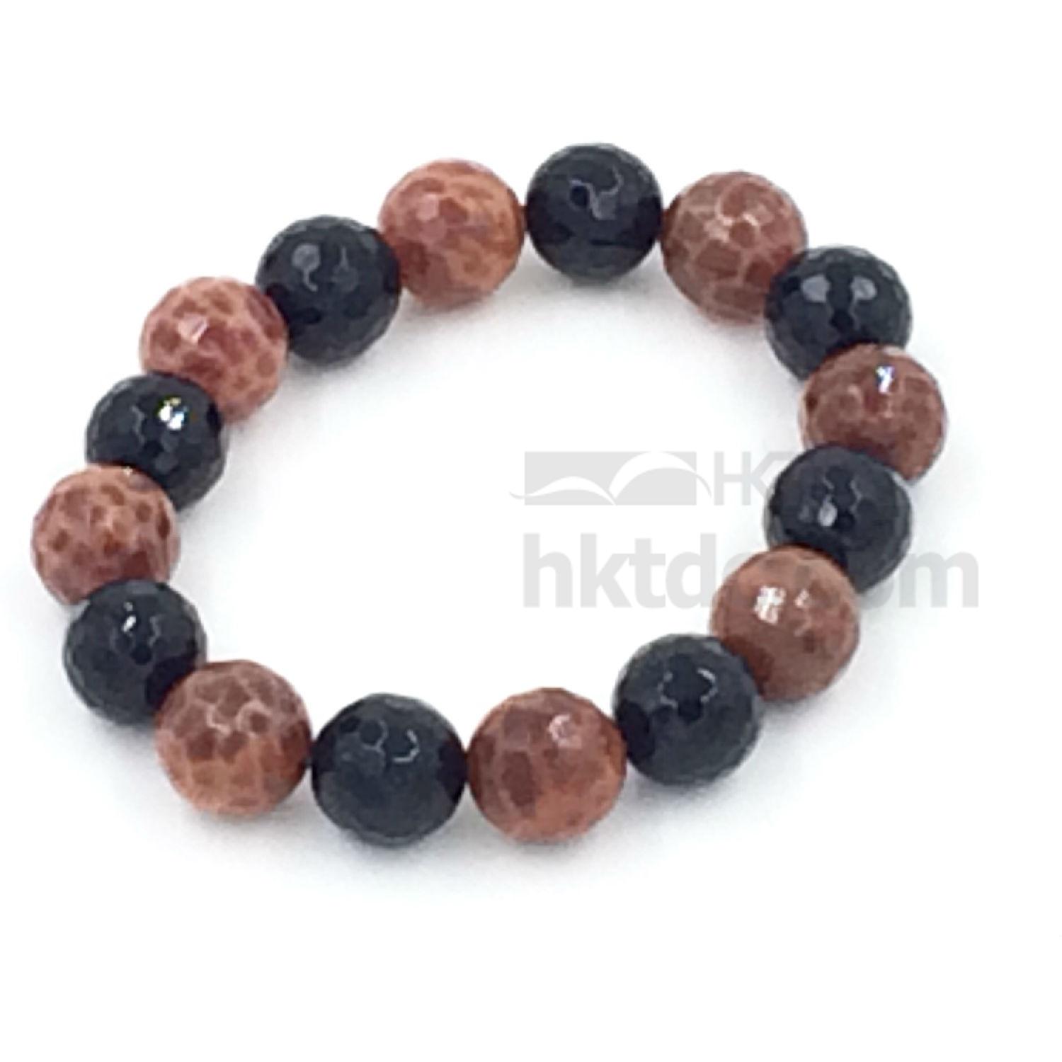 7.5" 12mm Faceted Cut Black Agate And Fire Agate Bead Elastic Cord Bracelet