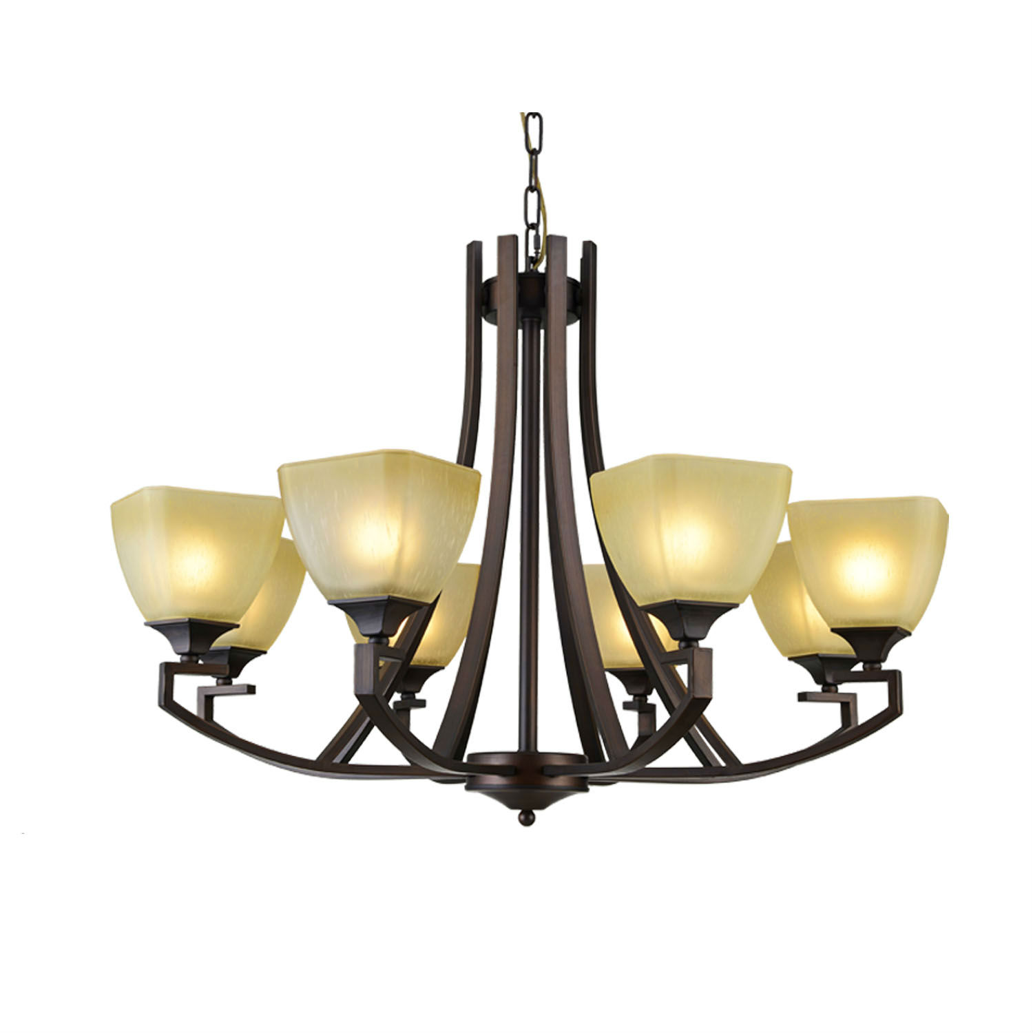 The displayed chandelier perfectly combines a design of antiquity as well as a spirit of modernity. Eight lamps are included, each of which is housed in an amber lamp shade to offer a warm glow. Decorate your living room with this chandelier to create a cozy atmosphere.