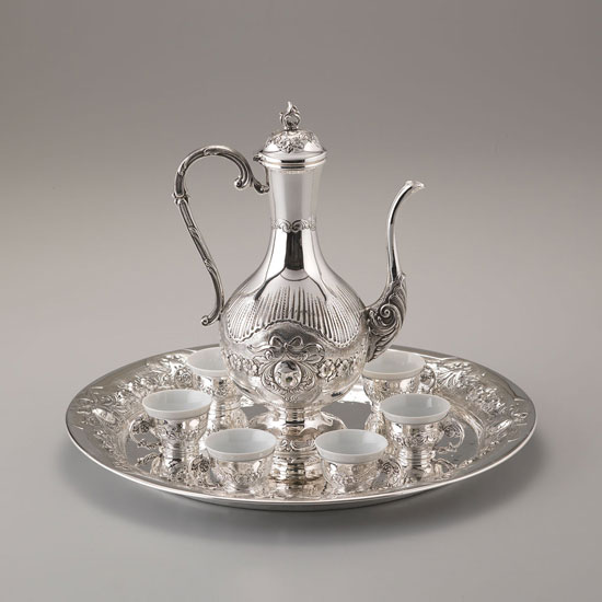 This 8-piece Arab coffee set comes with a coffee pot, a tray and 6 cups. They are carved with intricate patterns for an elegant touch. The large and ergonomic handle offers a firm and comfortable grip.