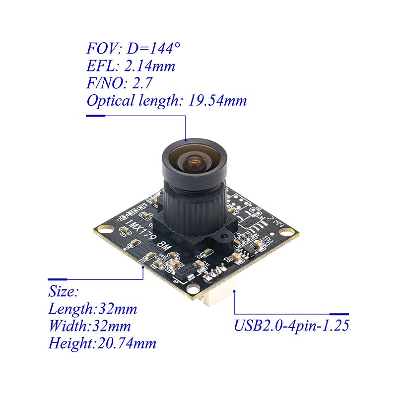 HAMPO-003-0023 is a high resolution with real 8MP USB camera module, adopt 1/3.2" high quality Sony IMX179 sensor fixed focus USB camera module, frame rate 3264*2448 at 30fps. 32*32mm of board size, FOV D=144° true and no distortion color image, perfect for document scanner, big LED screen display, education products like LED display, smart e-blackboard etc.