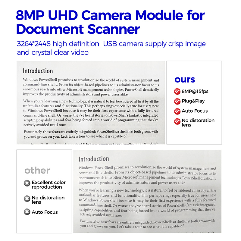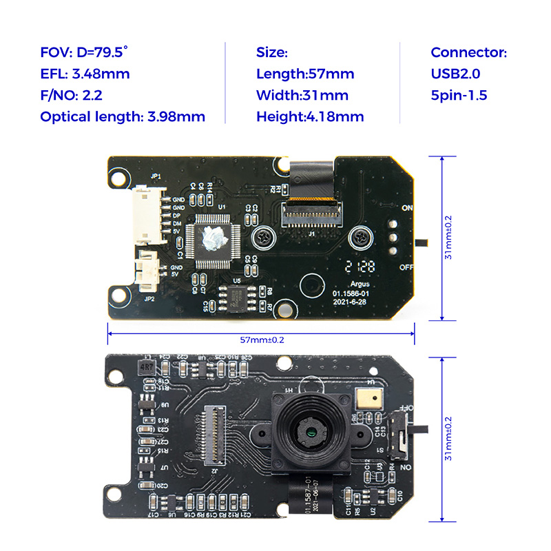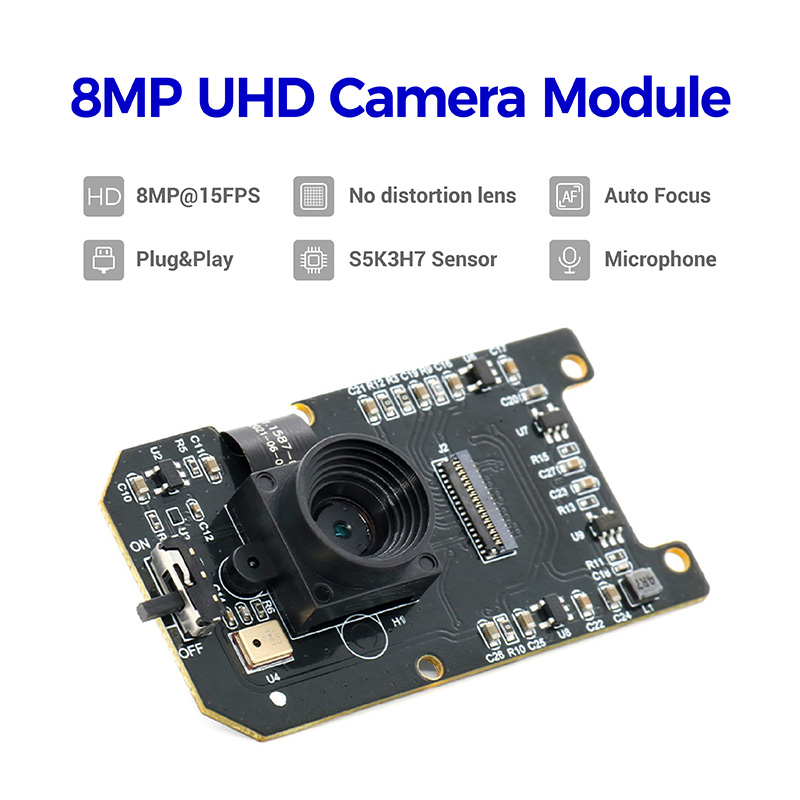 Hampo 003-1587 is an autofocus, 8 megapixel S5K3H7 CMOS sensor, image quality is very high and stable. The camera module has automatic focus function. Capture clear images of objects at different distances through autofocus. USB The connection port in the camera module supports USB 2.0 high-speed data transmission, and the USB of the camera board also supports OTG protocol (UVC). AF USB camera has a dedicated, high performance image signal processor chip that performs all automatic functions (automatic white balance, automatic exposure control), as well as a complete image signal processing pipeline, providing first-class image and video YUY2 and MJPEG compression Field of view 79.5° true color image without distortion, suitable for document scanner, LED large screen display, LED display, intelligent electronic blackboard and other educational products. Compatible with Windows 7, 8/10/11, Linux operating system.