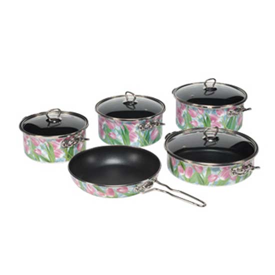 The 9-piece cookware set showcases a porcelain enamel design with darling floral patterns. Each cookware bestows a 3-layer non-stick coating for easy cleaning. The thoughtfully included glass covers promote efficient cooking while avoiding spilling. Prepare a mouth-watering meal for your family with this 9-piece cookware set.
