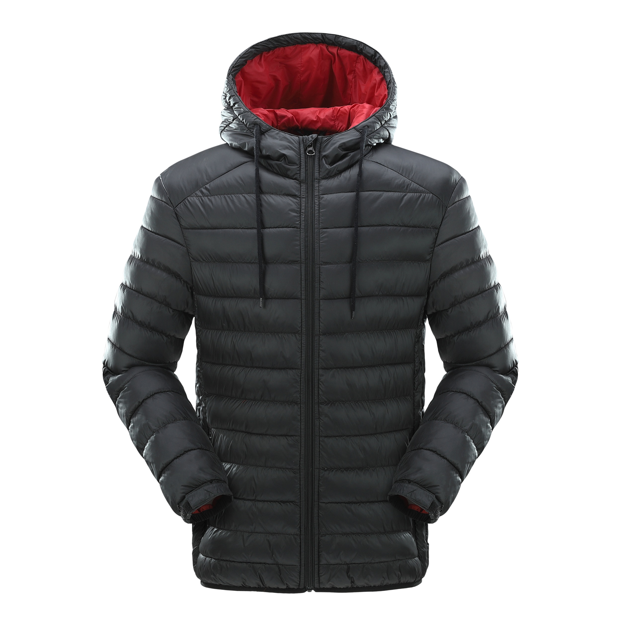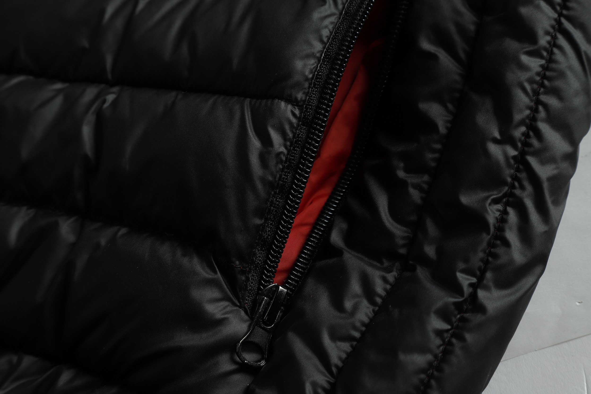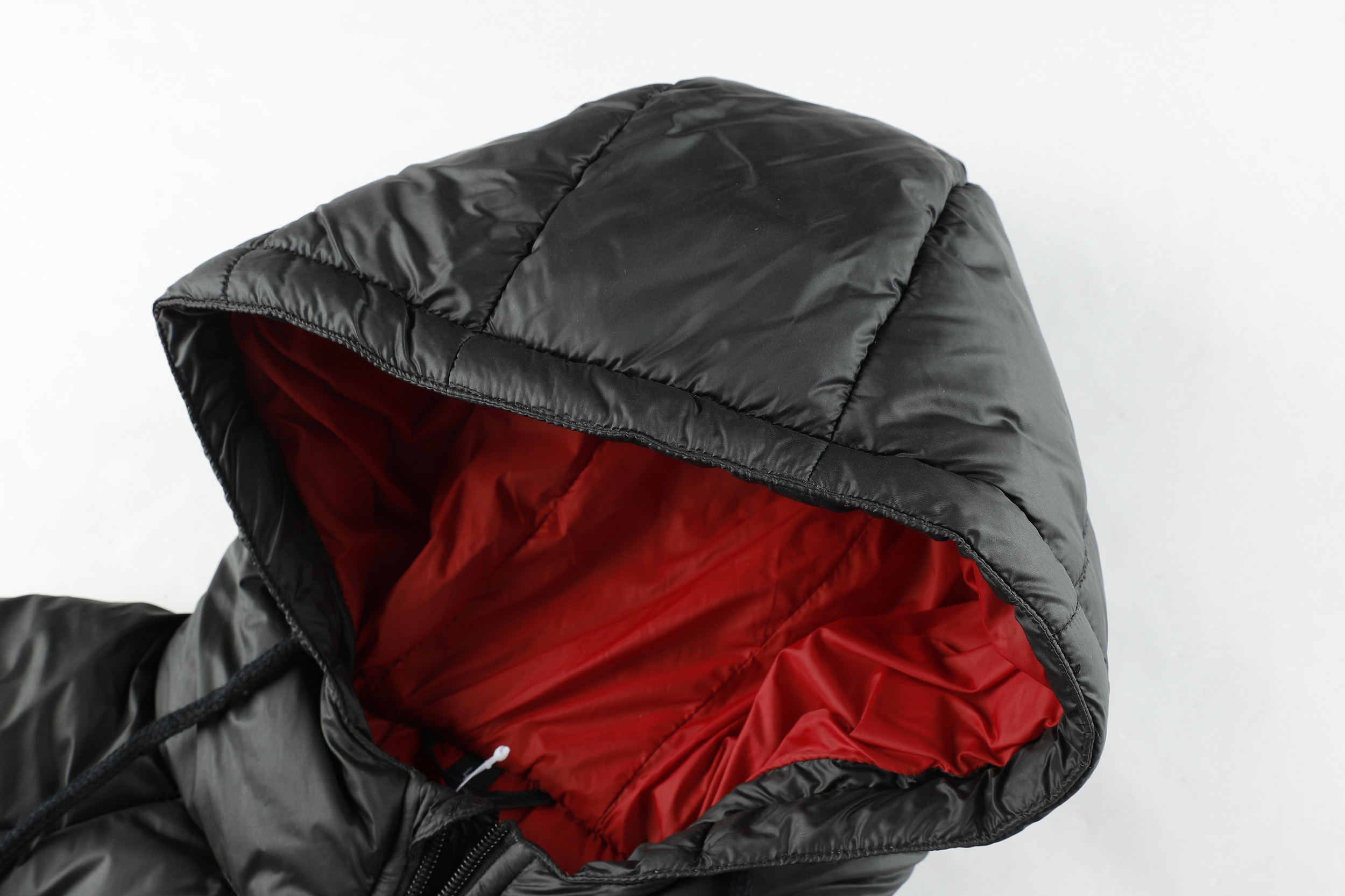 The image shows a black puffer jacket with a red-lined hood, designed for warmth and comfort in cold weather. The jacket features a front zipper and possibly additional snap buttons for closure. It has a quilted design, which is typical for puffer jackets, providing insulation. The hood is detachable, offering versatility in different weather conditions. The jacket also includes pockets, which are practical for carrying small items. The material appears to be water-resistant, making it suitable for outdoor activities. The overall design is functional and stylish, making it a practical choice for winter wear. The image also includes close-up views of the jacket's details, showcasing the quality and features of the garment.