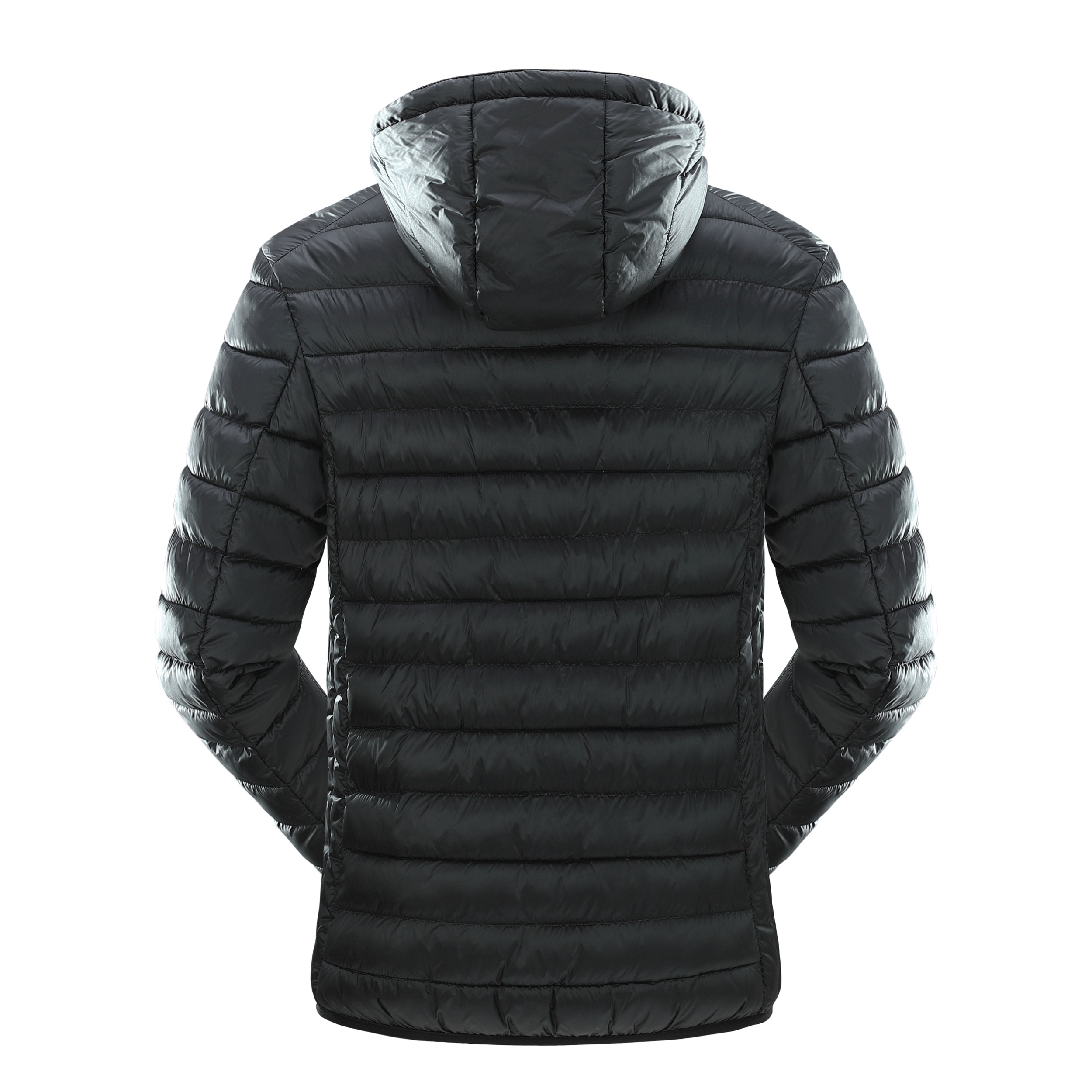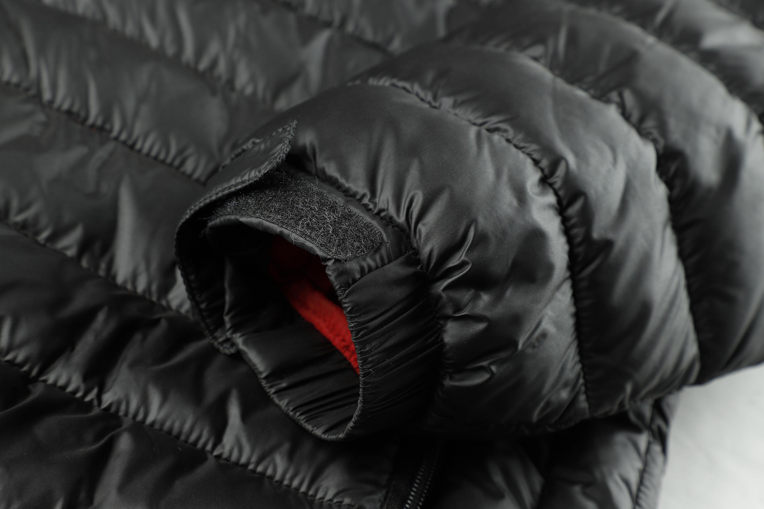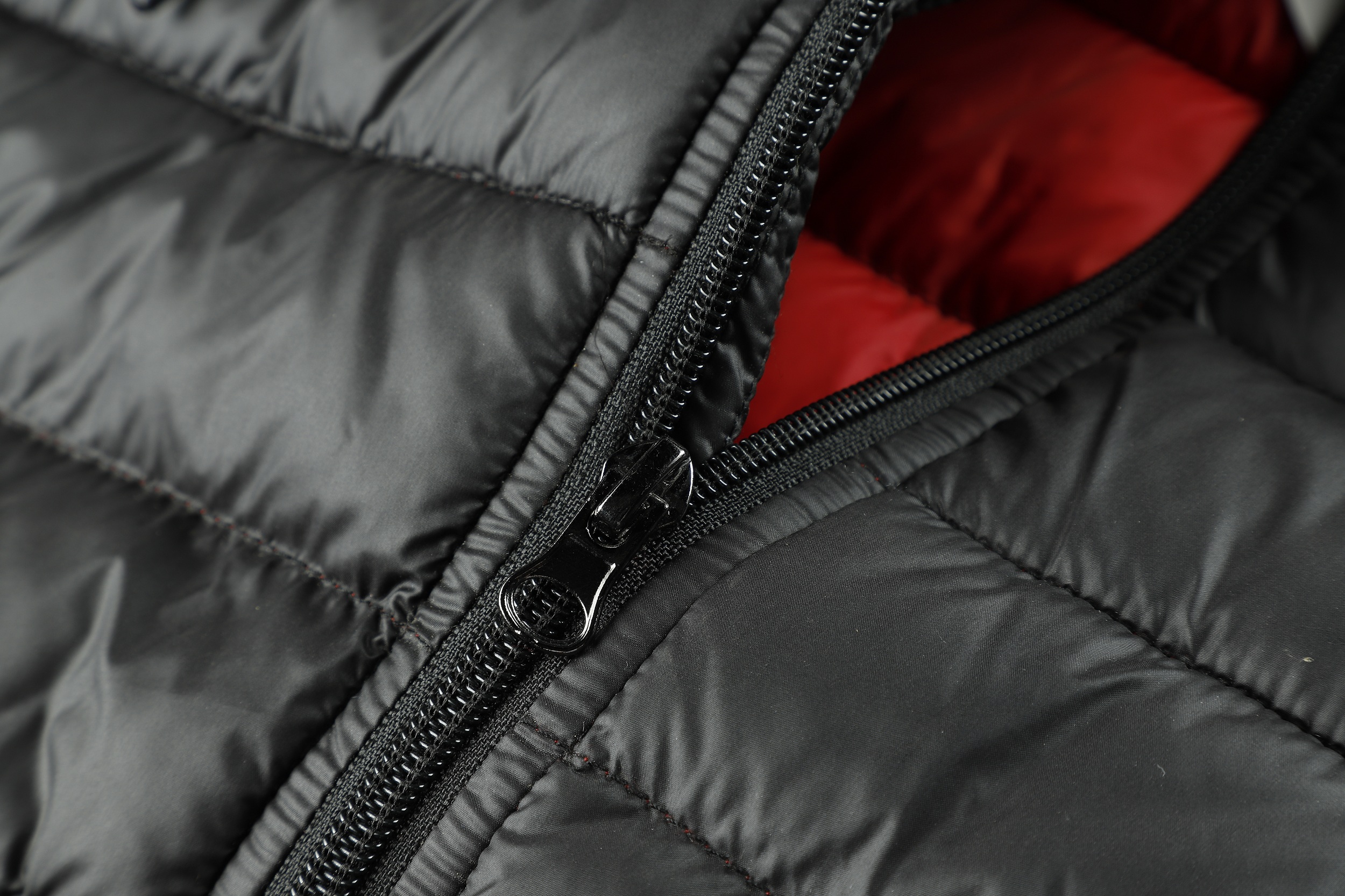 The image shows a black puffer jacket with a red-lined hood, designed for warmth and comfort in cold weather. The jacket features a front zipper and possibly additional snap buttons for closure. It has a quilted design, which is typical for puffer jackets, providing insulation. The hood is detachable, offering versatility in different weather conditions. The jacket also includes pockets, which are practical for carrying small items. The material appears to be water-resistant, making it suitable for outdoor activities. The overall design is functional and stylish, making it a practical choice for winter wear. The image also includes close-up views of the jacket's details, showcasing the quality and features of the garment.
