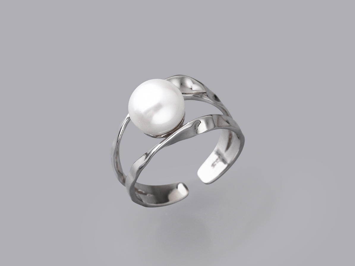 Sterling Silver Ring With 8-8.5mm Button Freshwater Pearl, Rhodium Plated