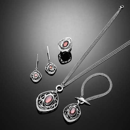 Capturing your attention is a 925 silver jewelry set with a delightful design. The enticing synthetic color stones offer added beauty and femininity. The jewelry set comprises a pair of earrings, a ring, a bracelet and a necklace.