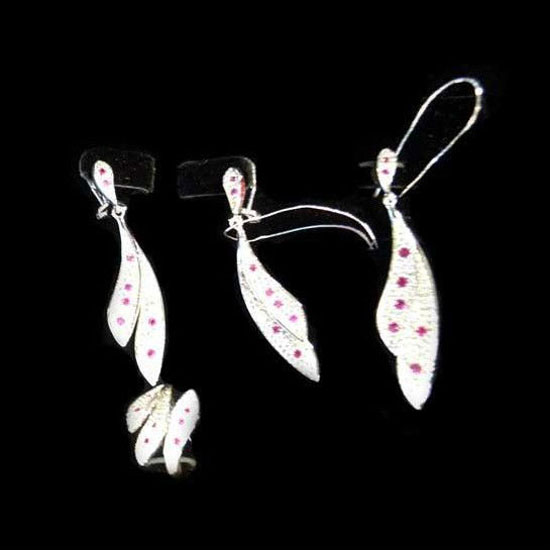 This jewelry set features a moth-like design with white wings and pink dot decorations. It is constructed from 925 silver for a deluxe touch. This distinctive jewelry set is sure to add an interesting touch to your look.