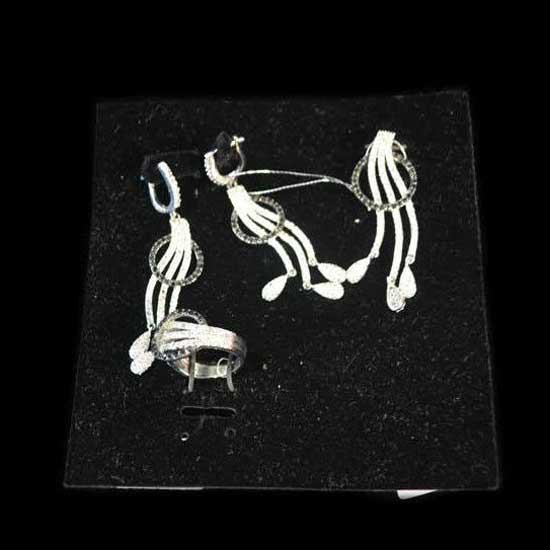 Displayed is a novel jewelry set made of 925 silver. Each piece comes with a ring with three waving lines going through it. This well-designed jewelry set is surely easy to mix and match.