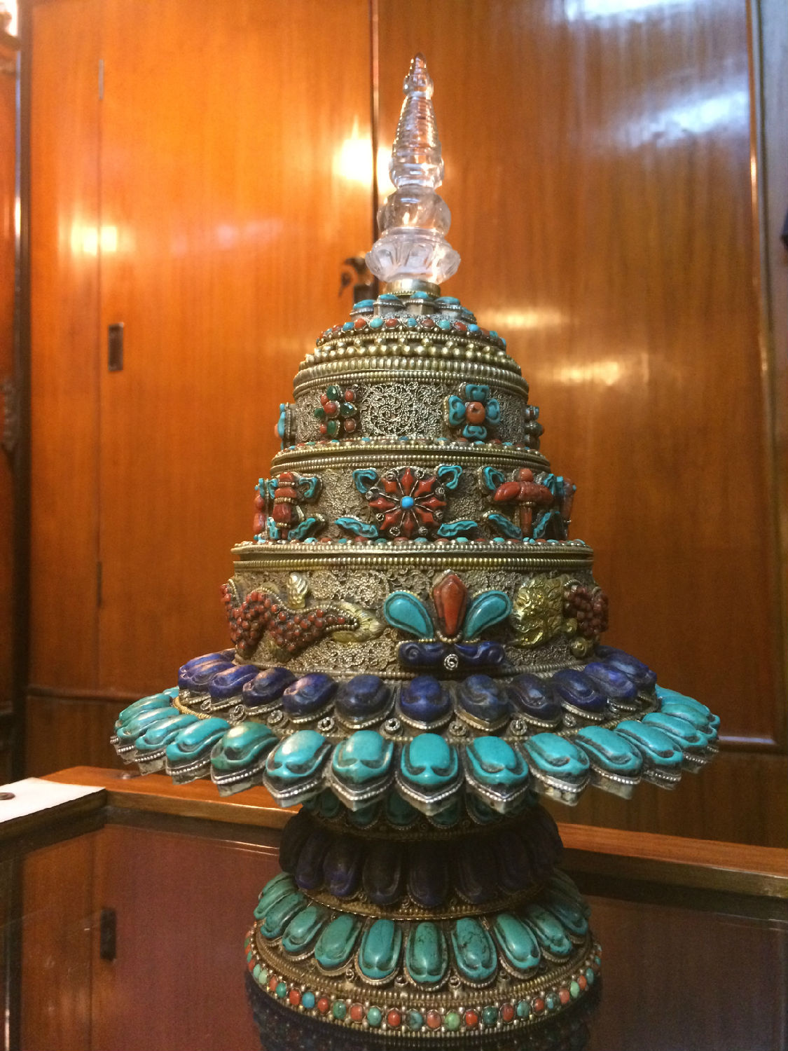 Hand carved Silver Stupa with Different Buddhas and auspicious Symbols
