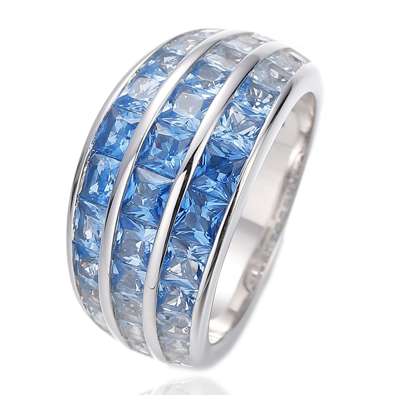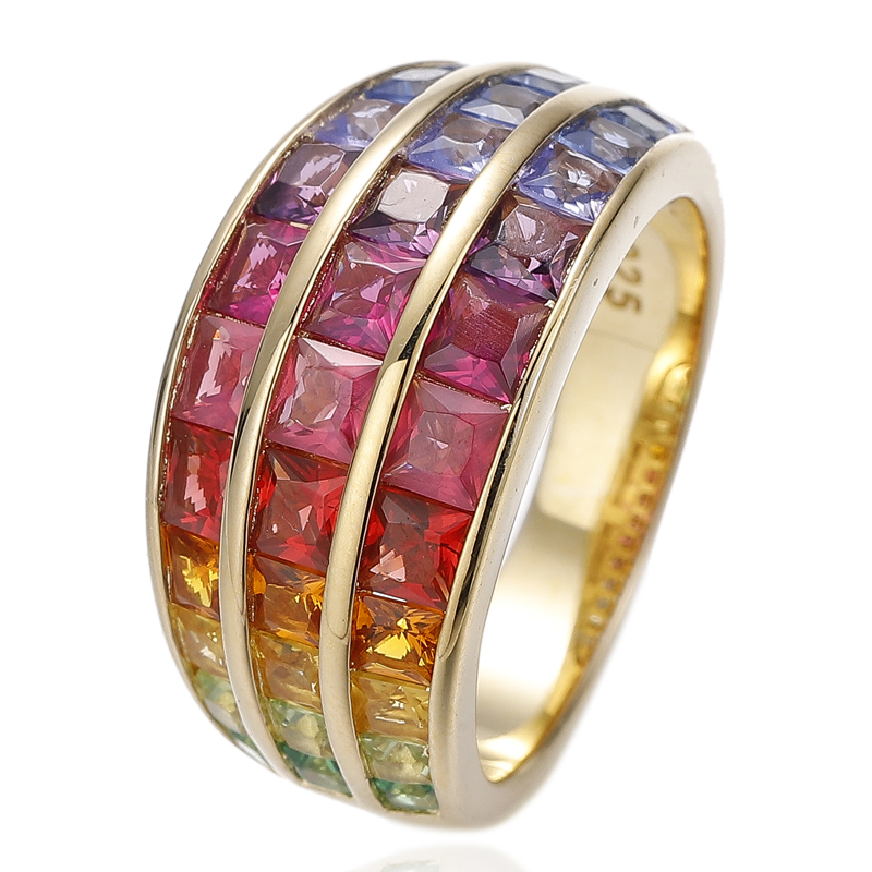 925 Square Rainbow Cubic Zircon Silver Ring With Gold Plating