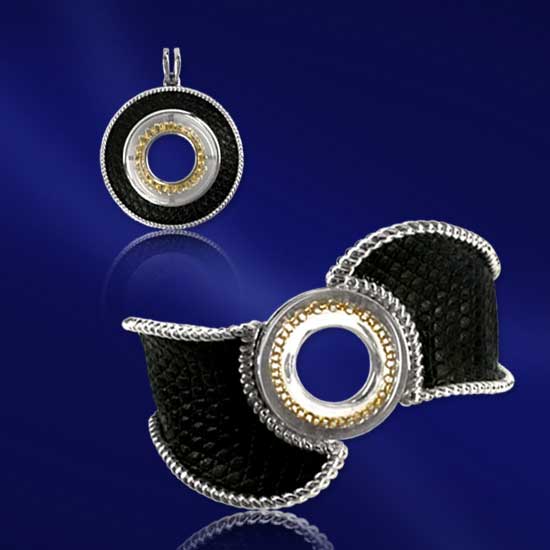 Featured is a bangle in a twisted design with a matching pendant. The design boasts a blend of woven leather and color resin. The silver settings are finely crafted with embossed details.