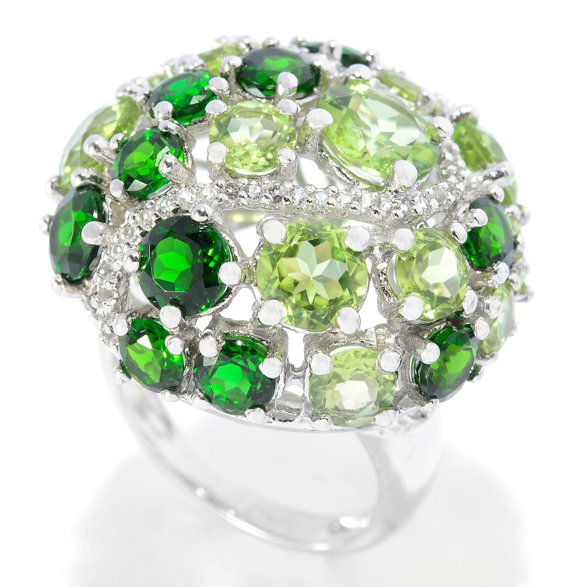 Crafted from rhodium over sterling silver, this ring features a gorgeous collection of round peridot, chrome diopside and topaz upon a domed design.