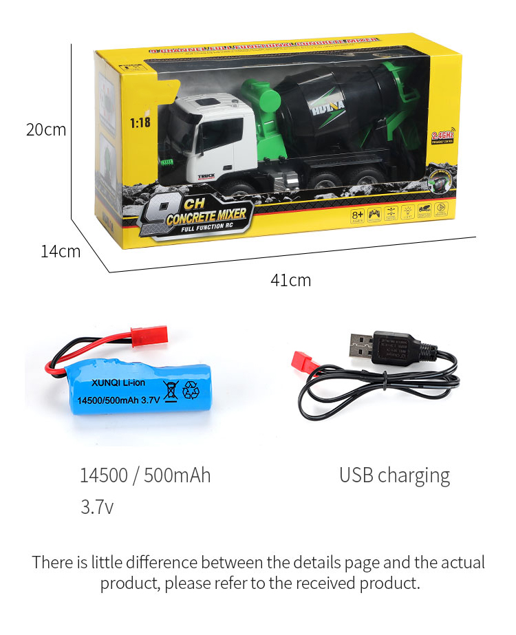 Restore the real appearance realoperation functions remote control.It can mix and discharge really put some materials in, press the rc button to make it rotate. Then the materials can be discharged,4WD 6-wheel, awesome for multiple terrains,anti-skid rubber tires. powerful 4WD. Climbing on multiple terrains fearlessly.