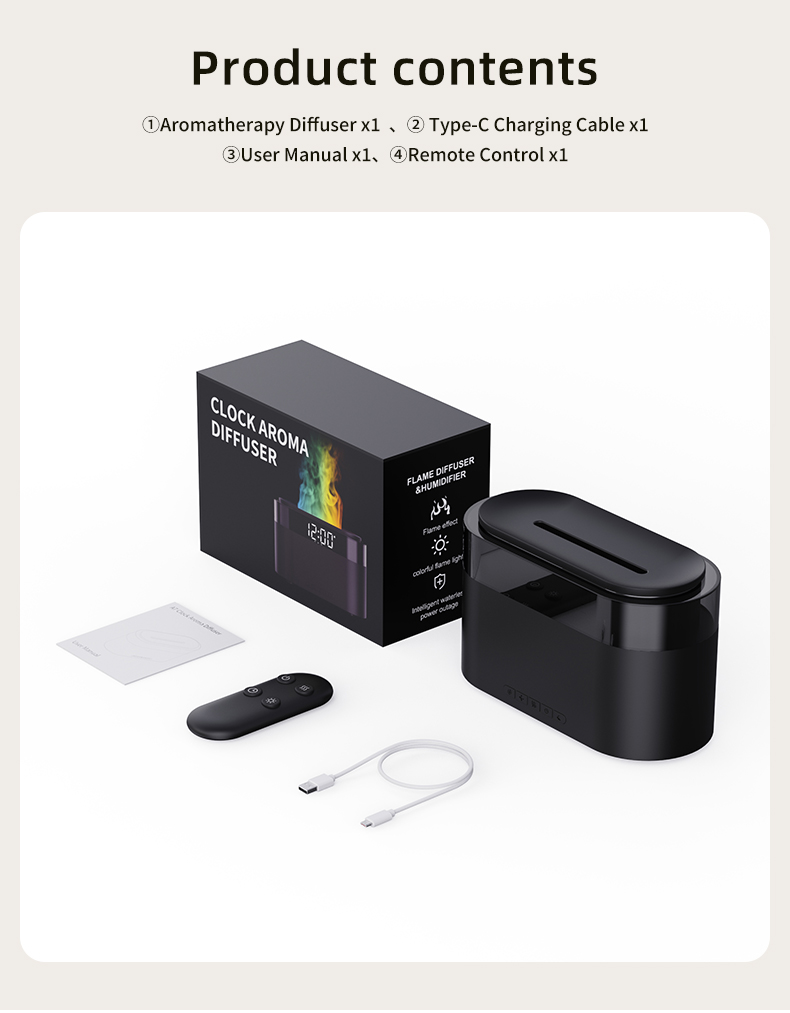 • 【Multi-Functional Aroma Diffuser】--- Our 4-in-1essential oil diffuser can be used as an aroma diffuser & humidifier & night light & digital clock at the same time. You can add a few drops essential oil into our aroma diffuser to relieve fragrance. The fine mist can swiftly disperse the essential oil molecules into the air and increase the room’s humidity. Our flame humidifier uses intelligent LED lights combined with mist to create a realistic flame effect. And the oil diffuser also has an LED clock display and gentle alarm.