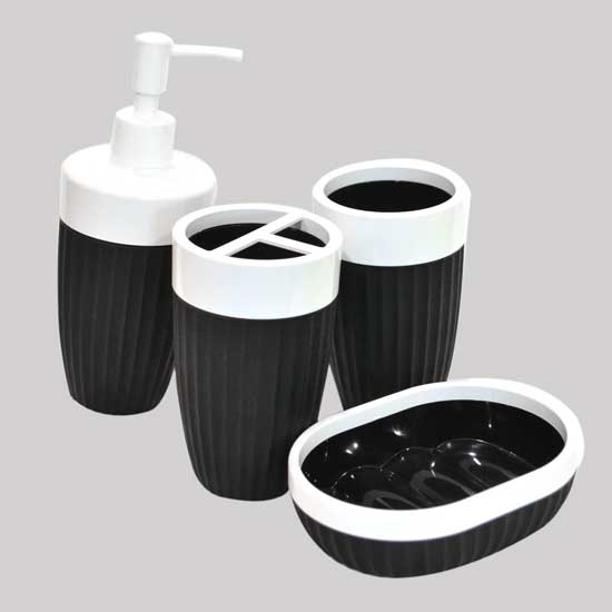 This four-piece ABS bathroom accessory set includes a liquid soap dispenser, a tumbler, a toothbrush holder and a soap dish. The tasteful bathroom accessories feature a black and white design. The durable ABS bathroom accessories can withstand daily wear and abrasion.