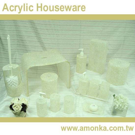 • Includes an acrylic bowl, a toilet brush holder, boxes, an acrylic chopping tool with a round tray, an acrylic dispenser holder, a lotion dispenser, a round-shaped tumbler, a soap dish, a tissue box and a remote control box.