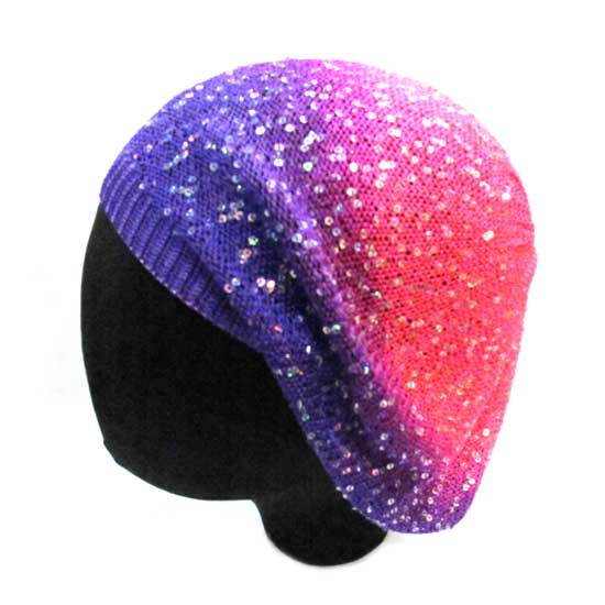 This charming acrylic cap features gradient tones in purple and pink. It is adorned with sparkling beads for extra appeal. This vibrant acrylic cap is a chic accessory for wear on cold days.