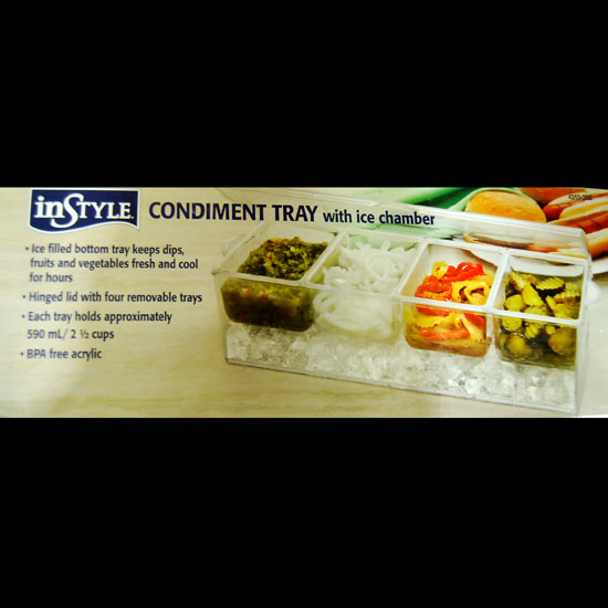 This transparent condiment tray comes with an ice chamber for keeping dips, fruits and vegetables fresh and cool for hours. The four removable tray design ensures convenient using. Made of BPA free acrylic, the condiment tray ensures safe using,