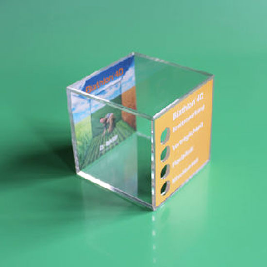 This is an acrylic box simply designed in a cute shape. It is crafted with colorful patterns and texts for promotional purposes. The quality acrylic material promises durability.
