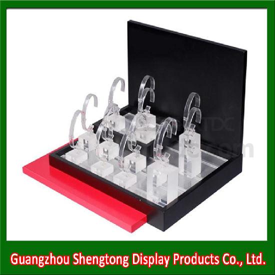 Showcased is a jewelry stand with a high-quality acrylic exterior for watch display. A backdrop panel is added for better security and is designed to be incorporated with customized logos and graphic artworks for a classy touch. Featuring a voguish black and red color palette, this watch display can clearly showcase your elegant watches in any window display.