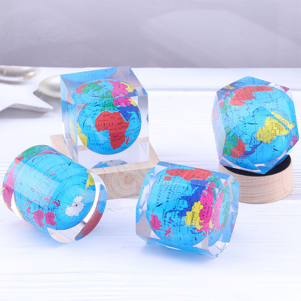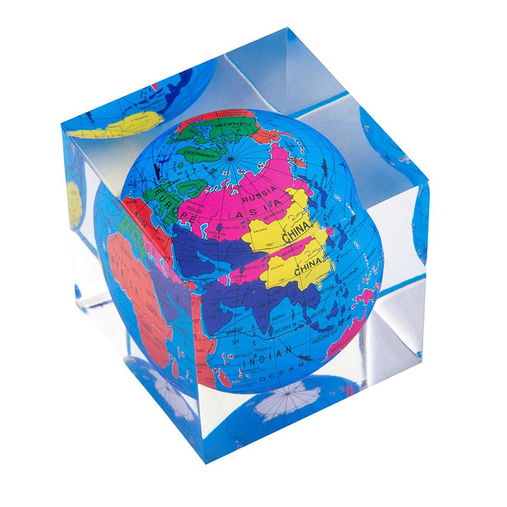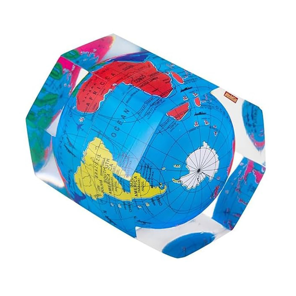 - Encases a bright, multi-color globe, with country and ocean names as well as lines of latitude and longitude