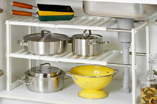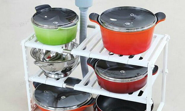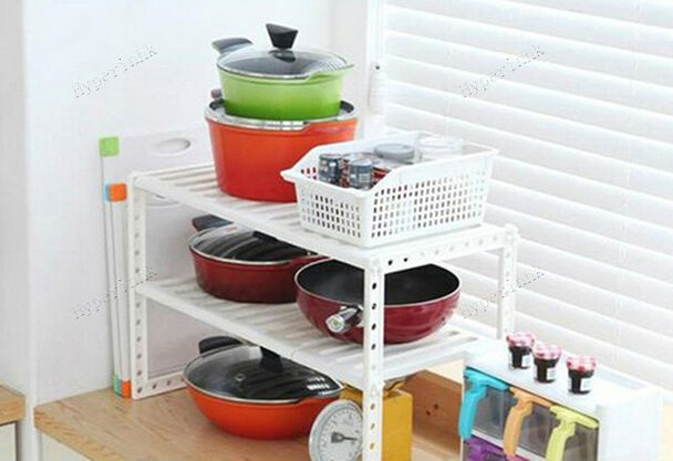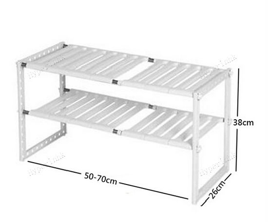This is a two-tier shelving unit with two adjustable shelves. Punched with equally spaced holes, the beams at the four corners allow users to fasten shelf brace ends and adjust shelf height to accommodate items of varying heights. With its sleek rectangular design, this item can be placed at corners to fully utilize kitchen space.