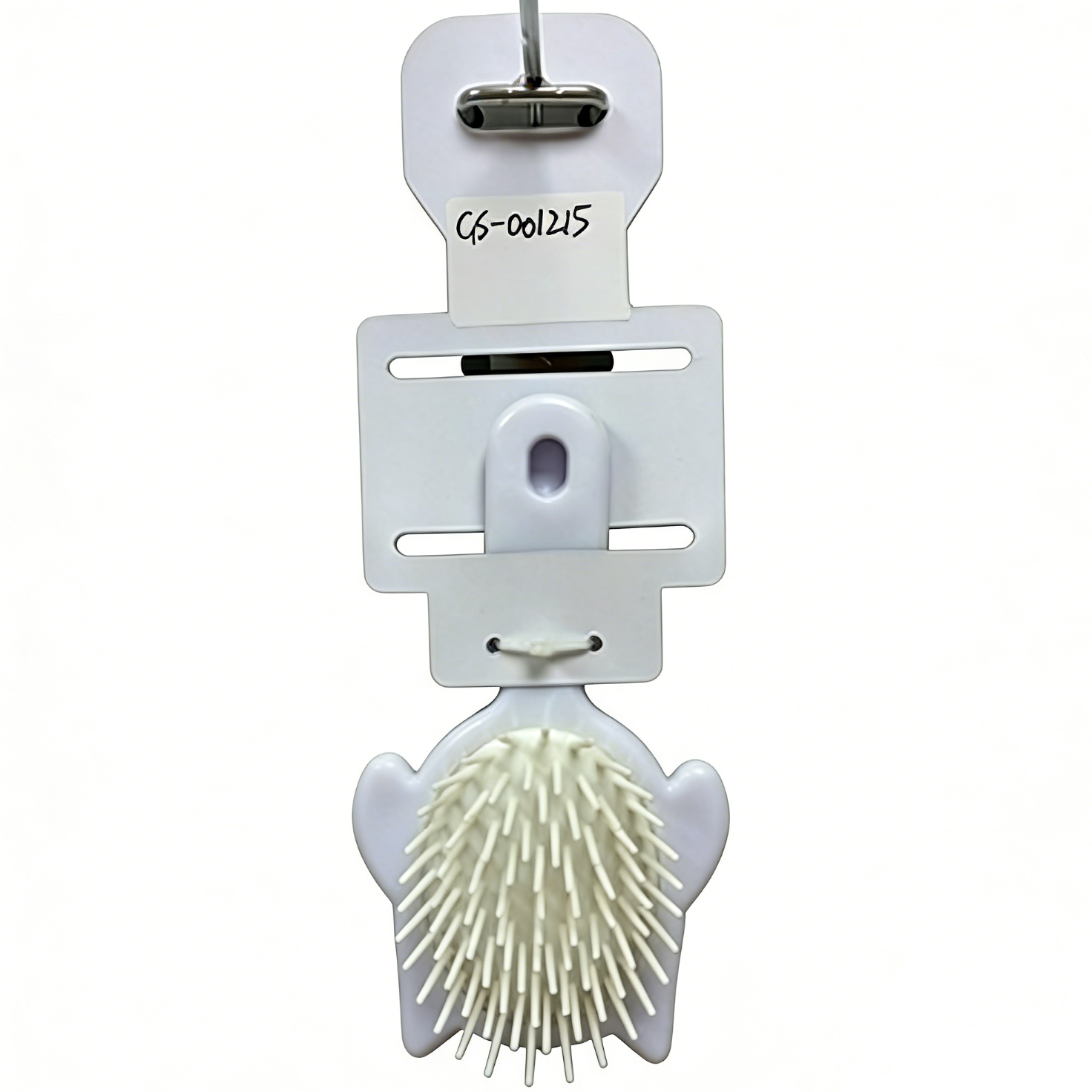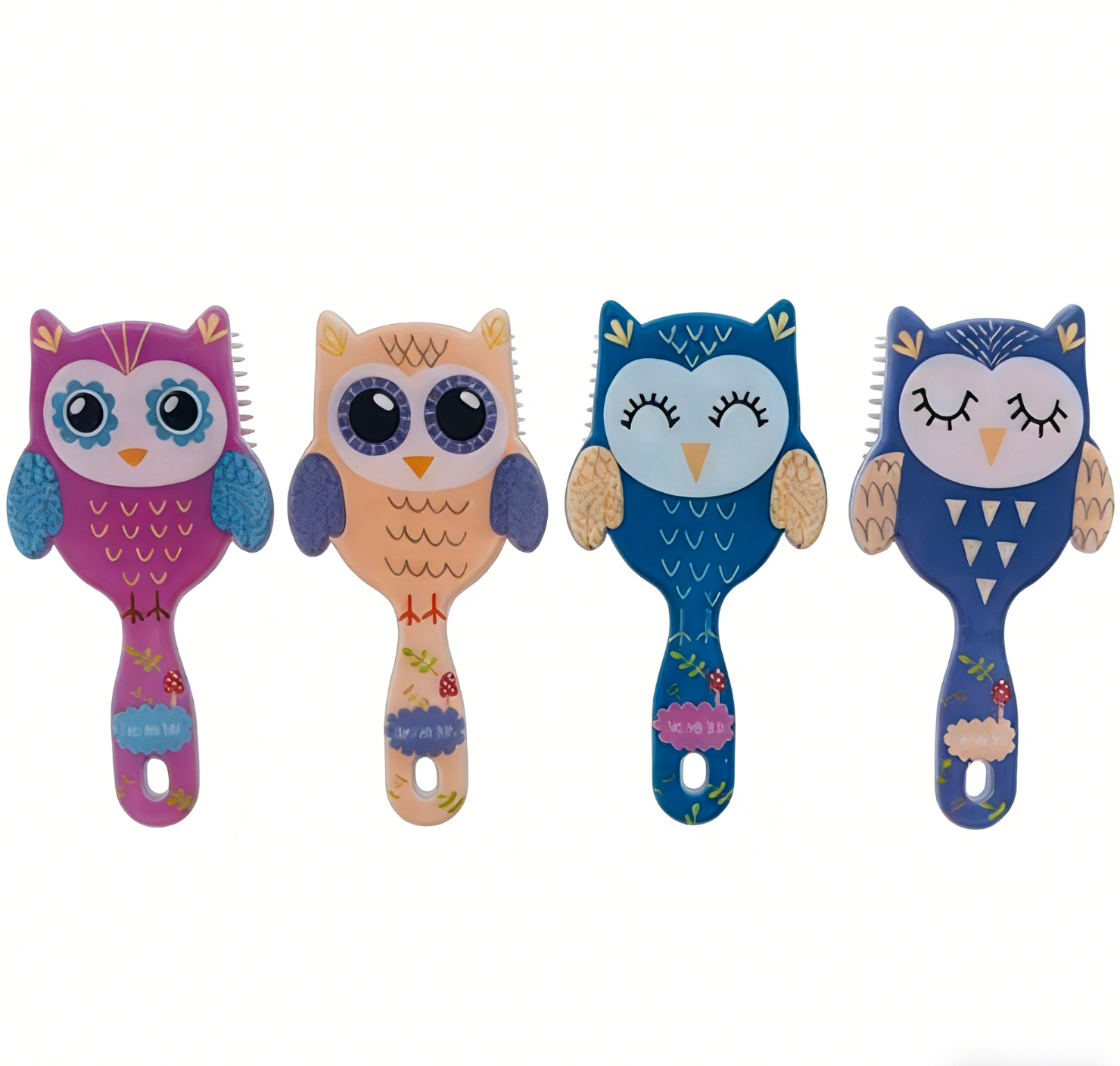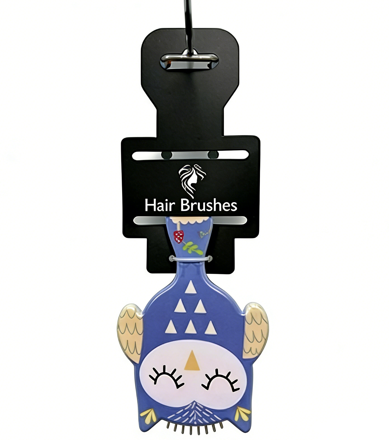 Small plastic hair brush with TREE pins and cushion, back with owl printing
