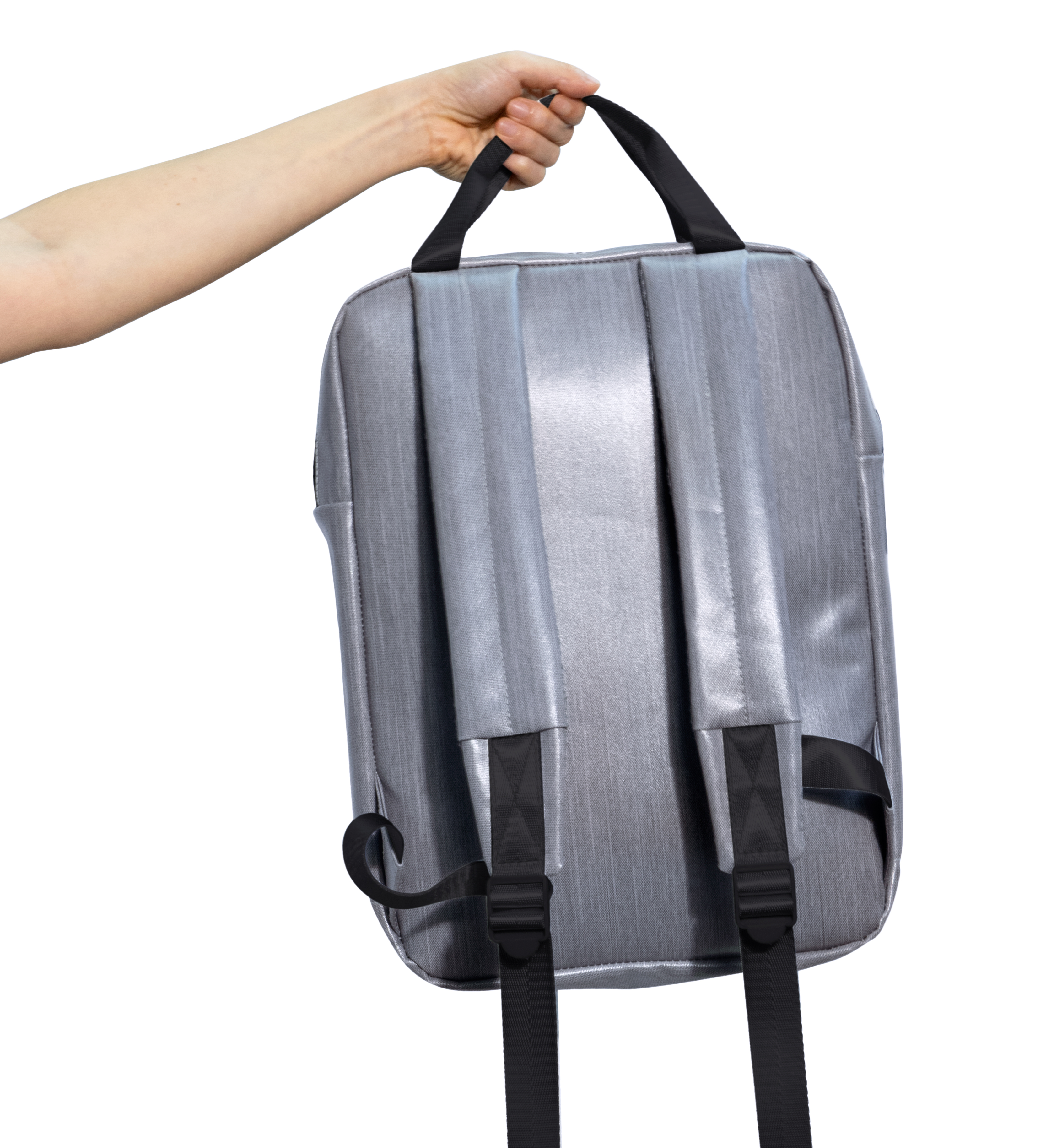 Bold, smooth zipper. Tote bag style double handles. Padded adjustable shoulder straps.