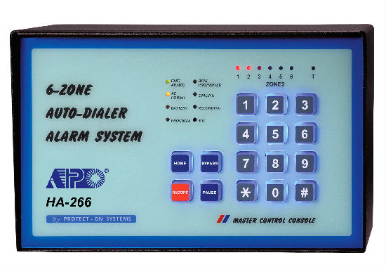 HA-266 is a compact auto-dialer alarm control panel with 6 hardware protection zones and 2 software zones for panic and duress alarms, which is designed for home and office protections. The system gives local alarm warnings as like the traditional alarm systems as well as sending voice message to 4 telephones of pre-set numbers when alarm occurs. The auto dialer is compatible with all the public telephone systems. The control panel comes with a built-in full feature control console for ready installation.
