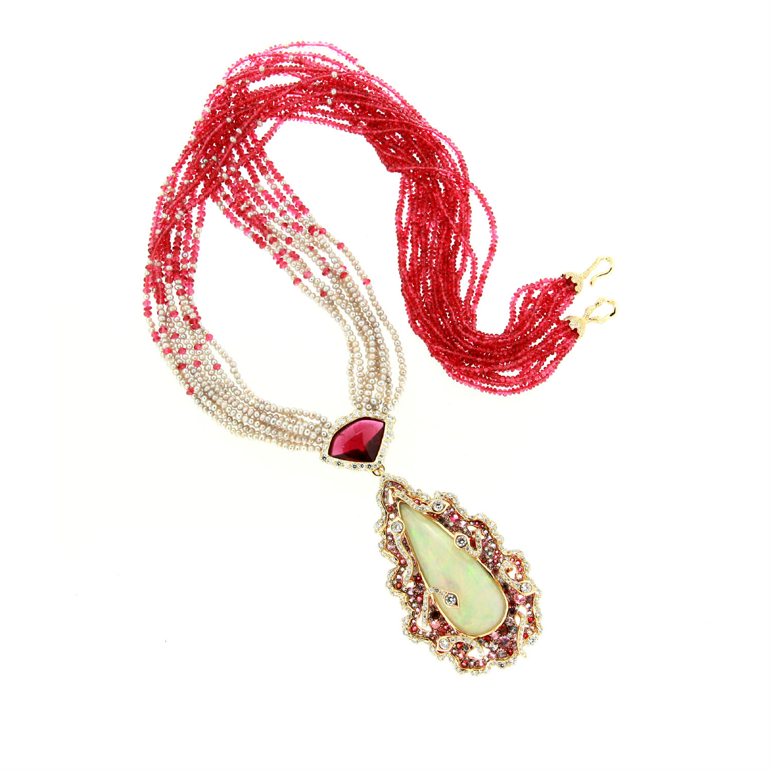 The sumptuous MASTERSTROKES necklace from the collection Ali baba & forty thieves is composed of 28.44 carats of Opal depicted as Alibaba-hero of the piece, grasped in asymmetrically detailed Champleve style French enamel backdrop, wrapped with Diamond studded forms and 9.68 carats of Tourmaline, holding the seven hidden thieves of which one falls unseen on the other side. The silhouette can be worn from both the sides, with a total of 7.61 carats of brilliant cut Diamond surrounding 186 carats of Spinel beads and 41.8 carats of Pearl beads and 5.61 carats of Spinel, the piece was designed & hand-crafted in 601 work hours.