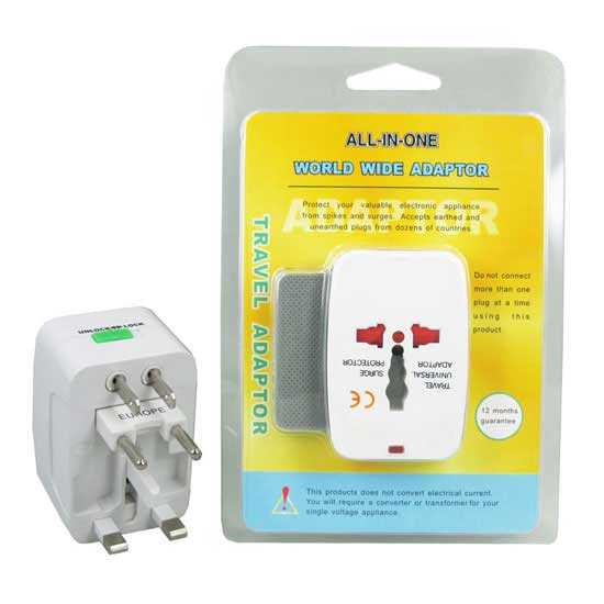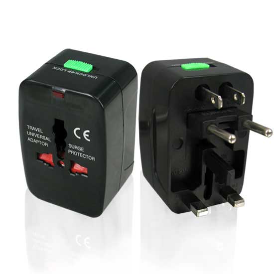 This all-in-one travel adapter is equipped with a surge protector (anti-thunder). This piece is a compact and one-piece unit with 4 international adapters. The item fits the plugs in Europe, the UK, USA, China, Japan, Australia, Spain and almost every country in the world.