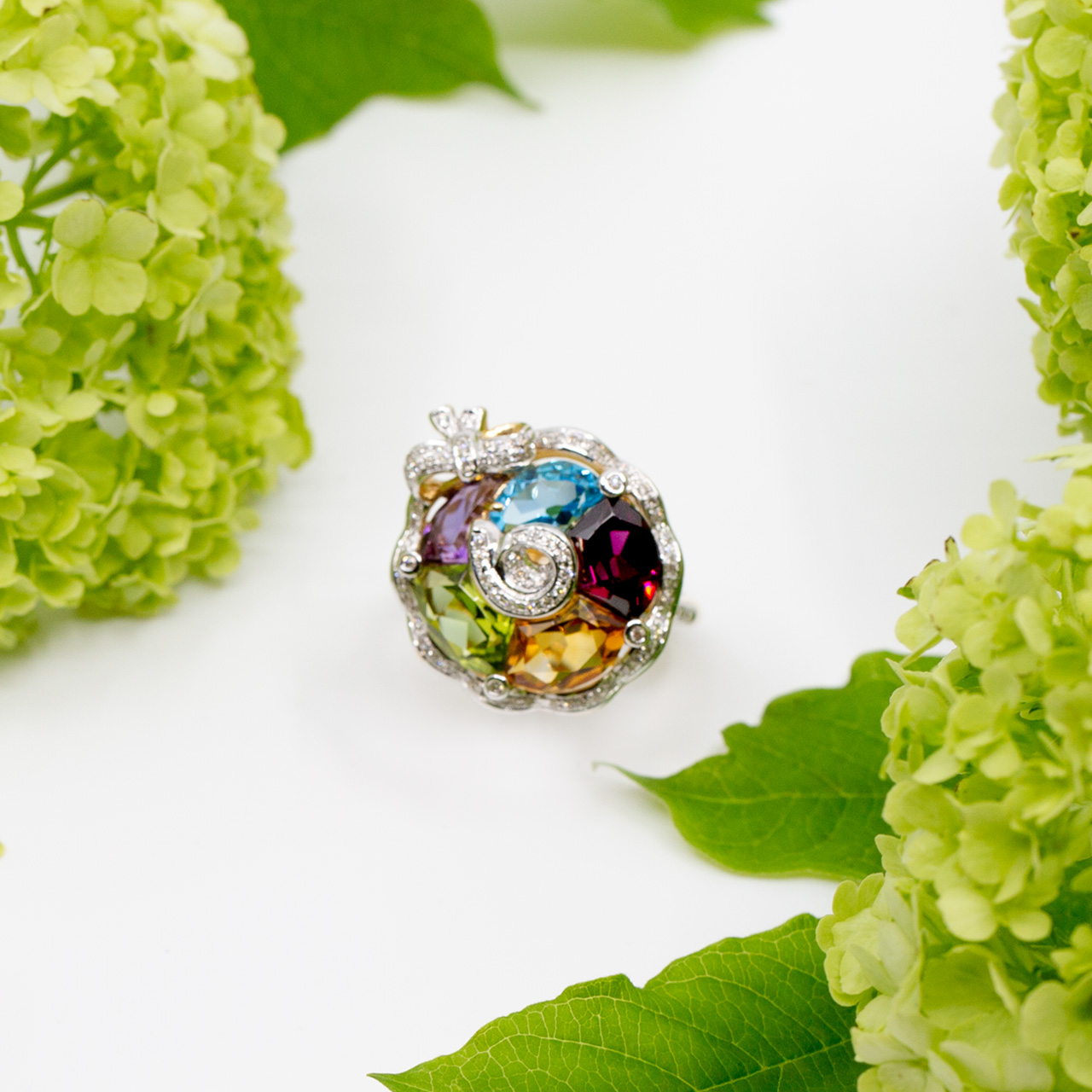 Allium Rainbow Gemstone Princess Cut Snail bowtie Ring with Diamond.