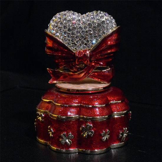 This alloy jewelry box has crystals embedded as decoration. This distinctive and delicate alloy gift box is red in color. This glittering alloy container is extremely suitable to be a jewelry box.
