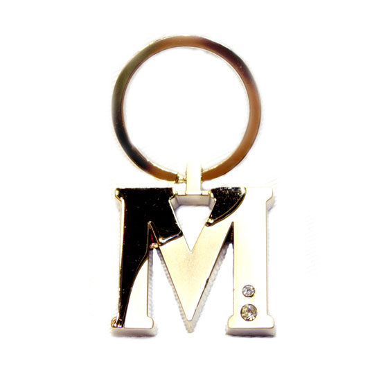 As shown is a keychain constructed with solid zinc alloy. It is slung with an "M" ornament accentuated with splendid trimmings. The ornament also touts an arresting burnished finish.