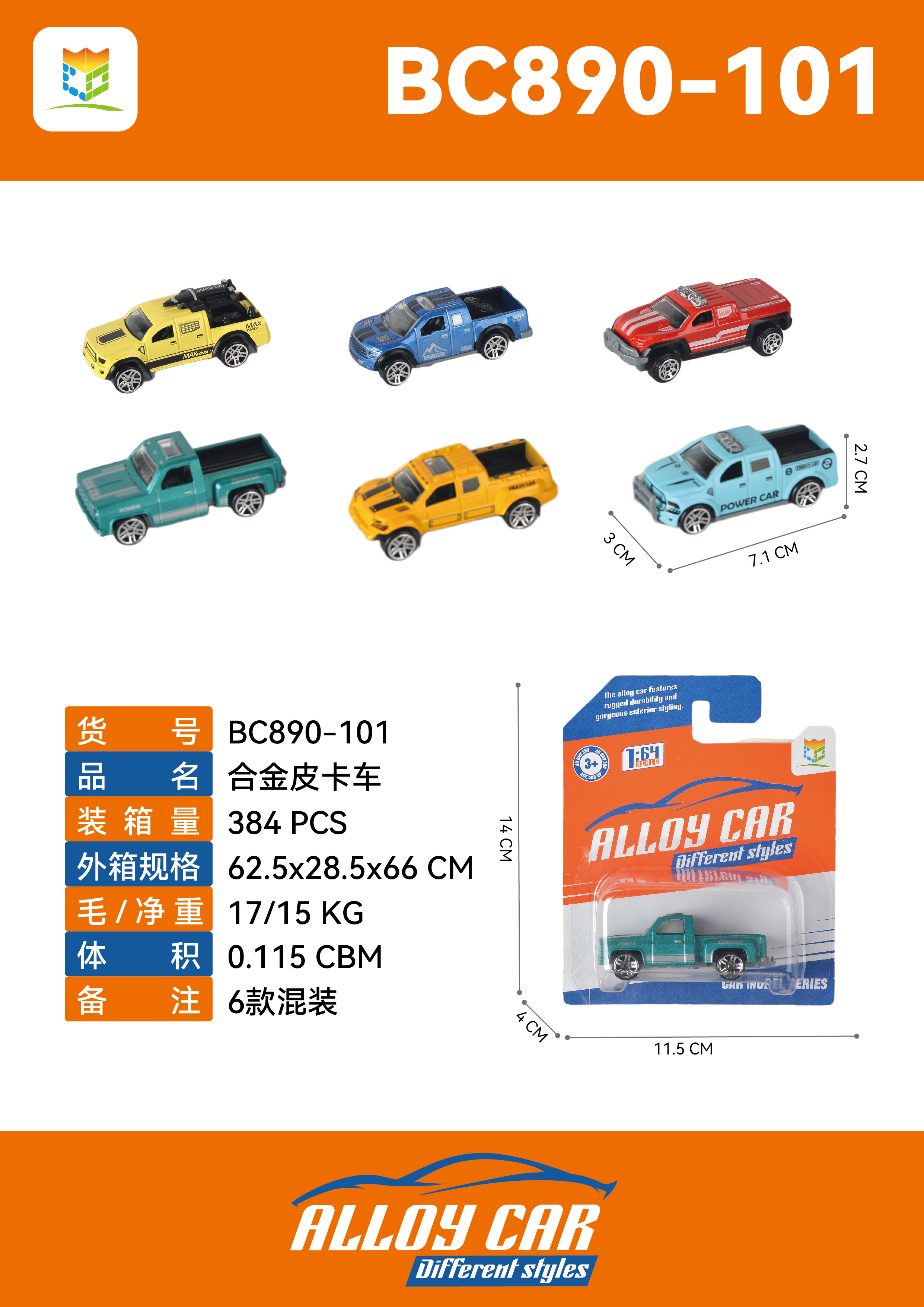 Six different types of blister packing alloy pickup trucks mixed
